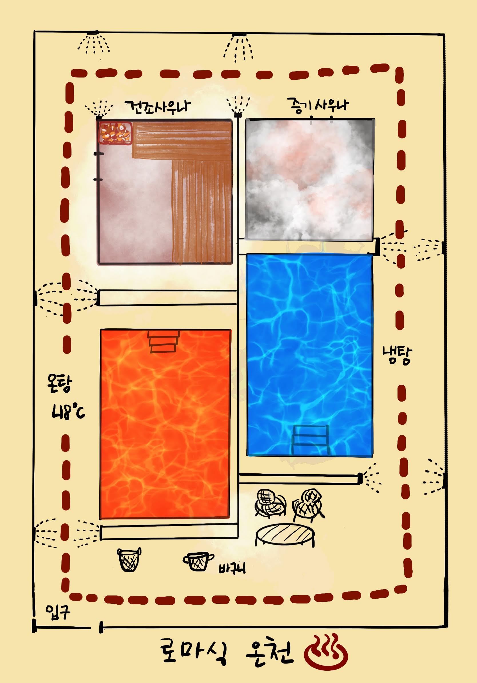 이렇게 로마식 온천에 들어가니...... 오~~~ 역사는 꽤 있는 온천인데 규모는 상당히 작았습니다. 로마식이라고 해서 로마식 건물 스타일 온천인 줄 알았는데 아니더라고요. 적어도 로마식 모자이크 벽이라도 장식되어 있을 줄 알았는데 그냥 현대식으로 개조한 느낌이라 깜짝 놀랐습니다.