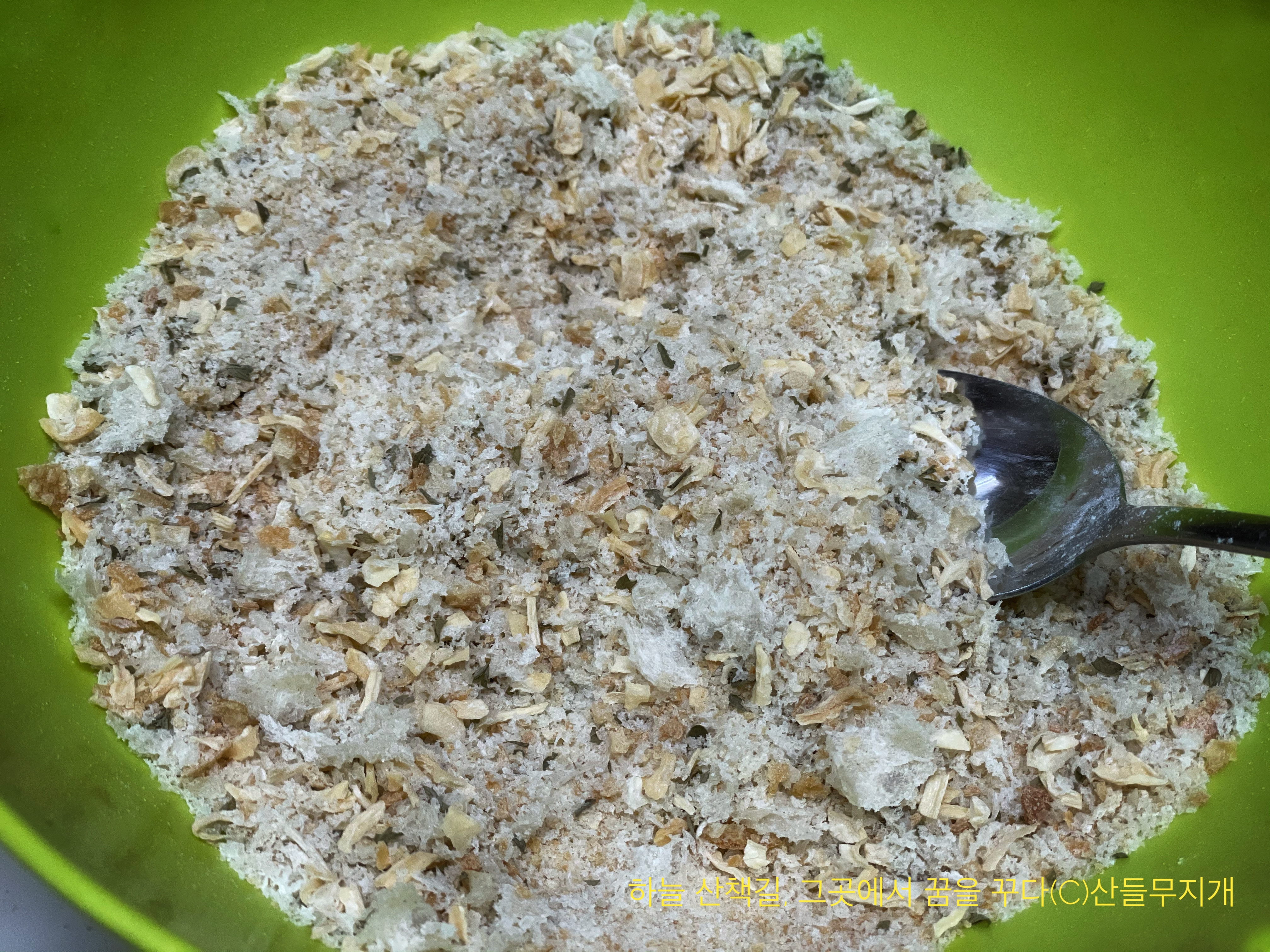 가장 중요한 것은 위의 빵가루에 양념을 첨가해주는 겁니다.