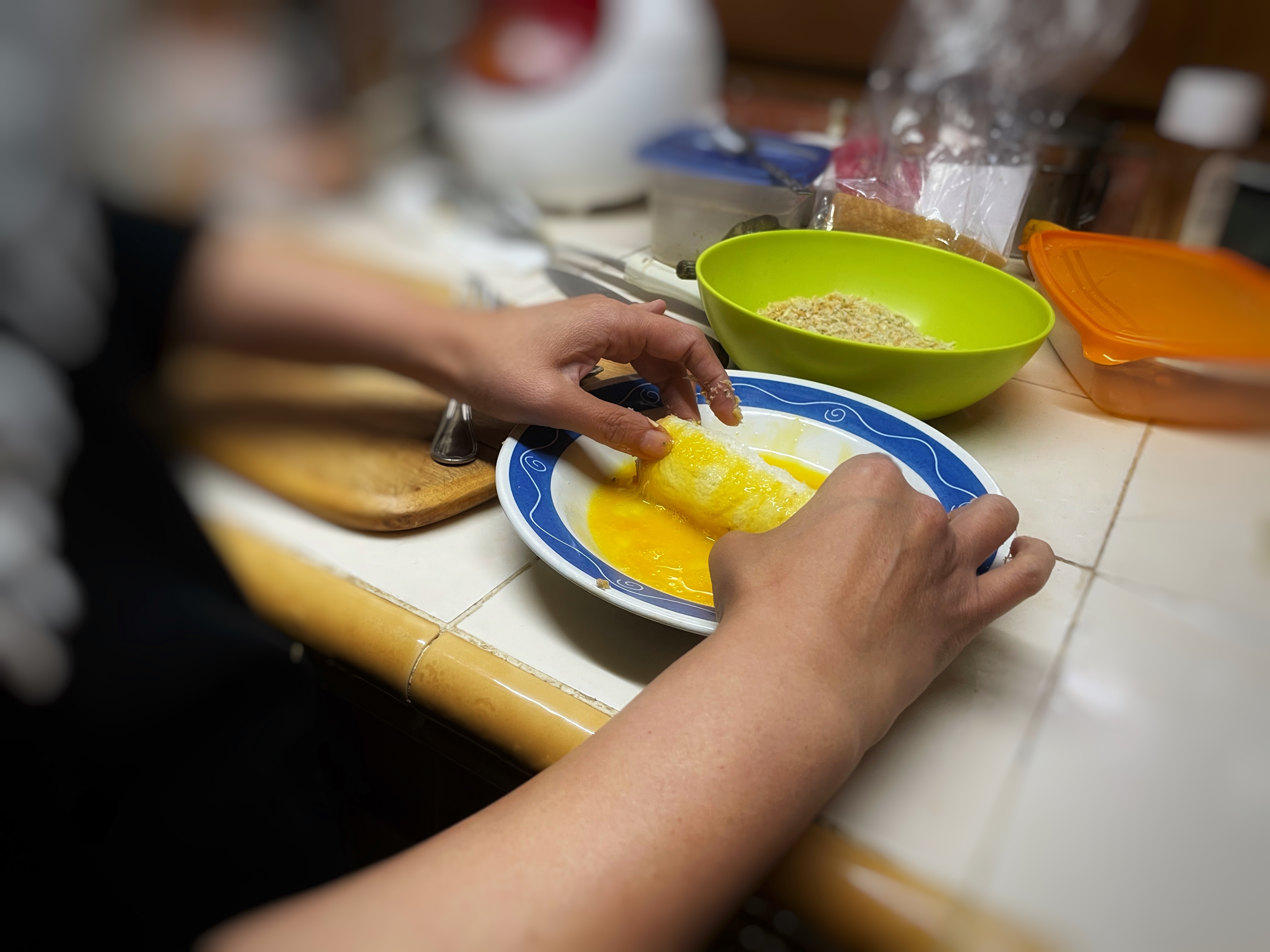 그리고 달걀물에 한 번 돌렸다가 바로 빵가루를 묻혔지요!!!