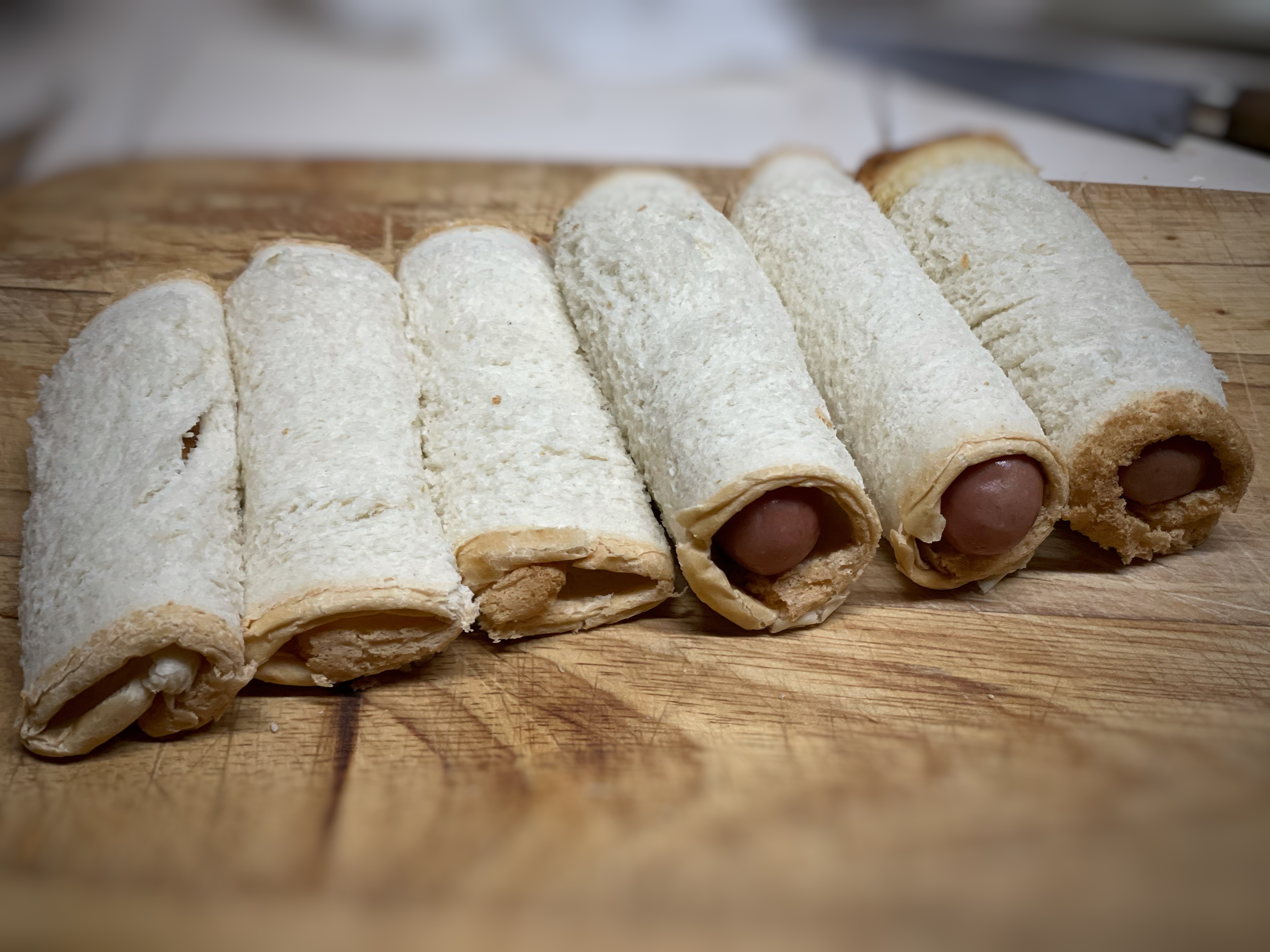 홍두깨로 납작하게 밀어준 식빵에 이렇게 소세지와 치즈를 담아 돌돌 말았어요.