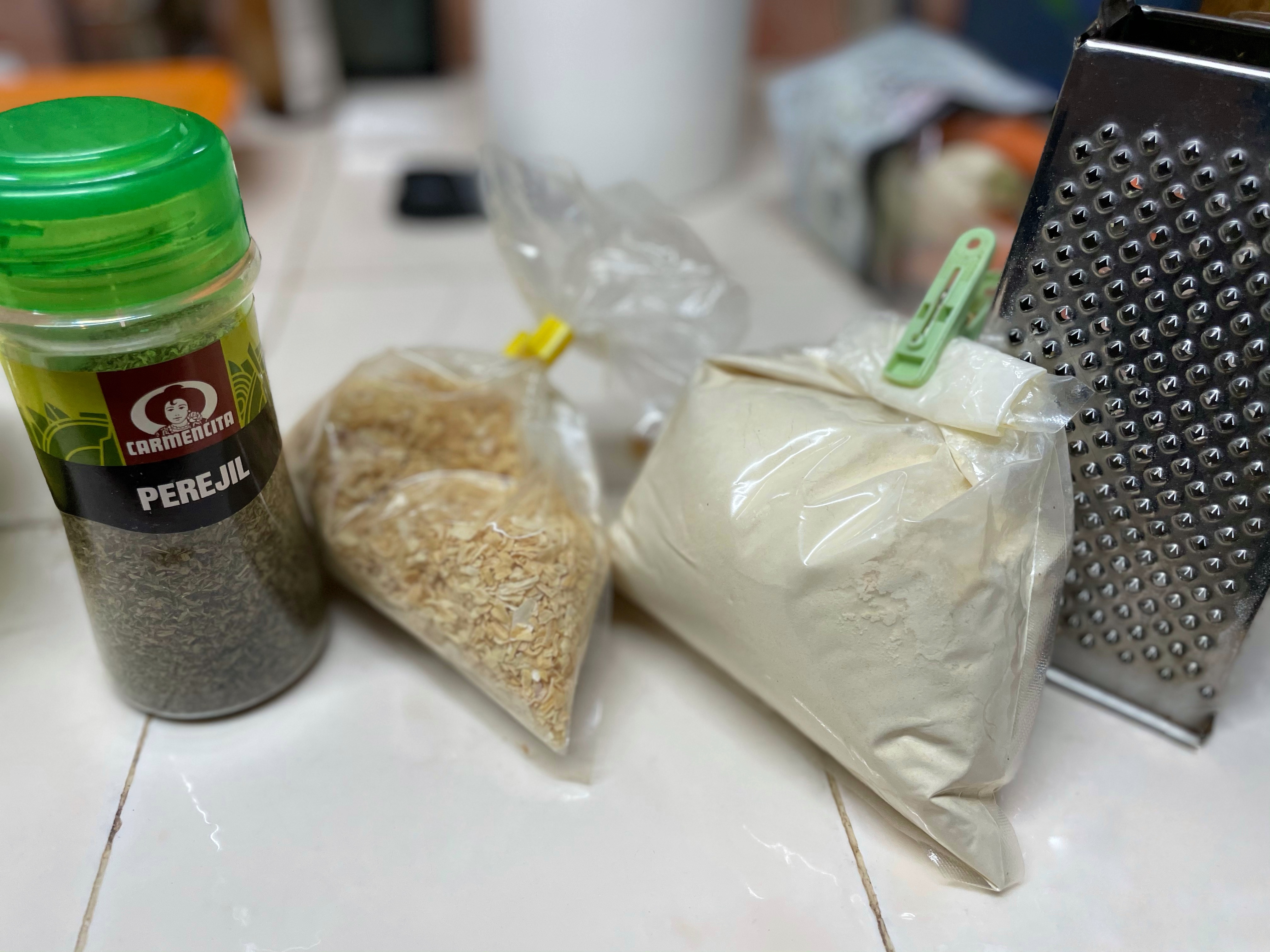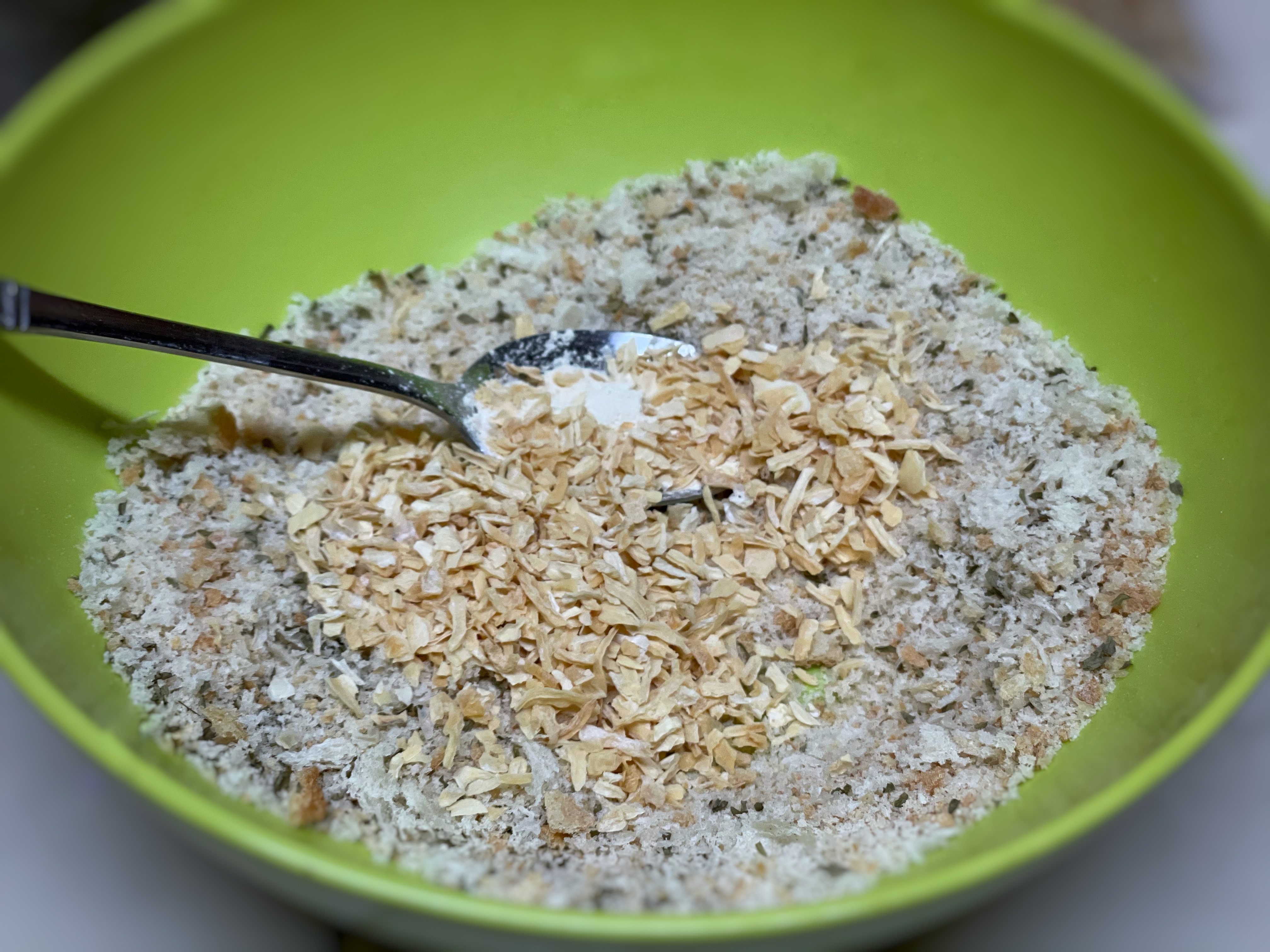 파슬리 가루, 건조하거나 튀긴 양파, 마늘 가루 등을 빵가루에 첨가합니다.