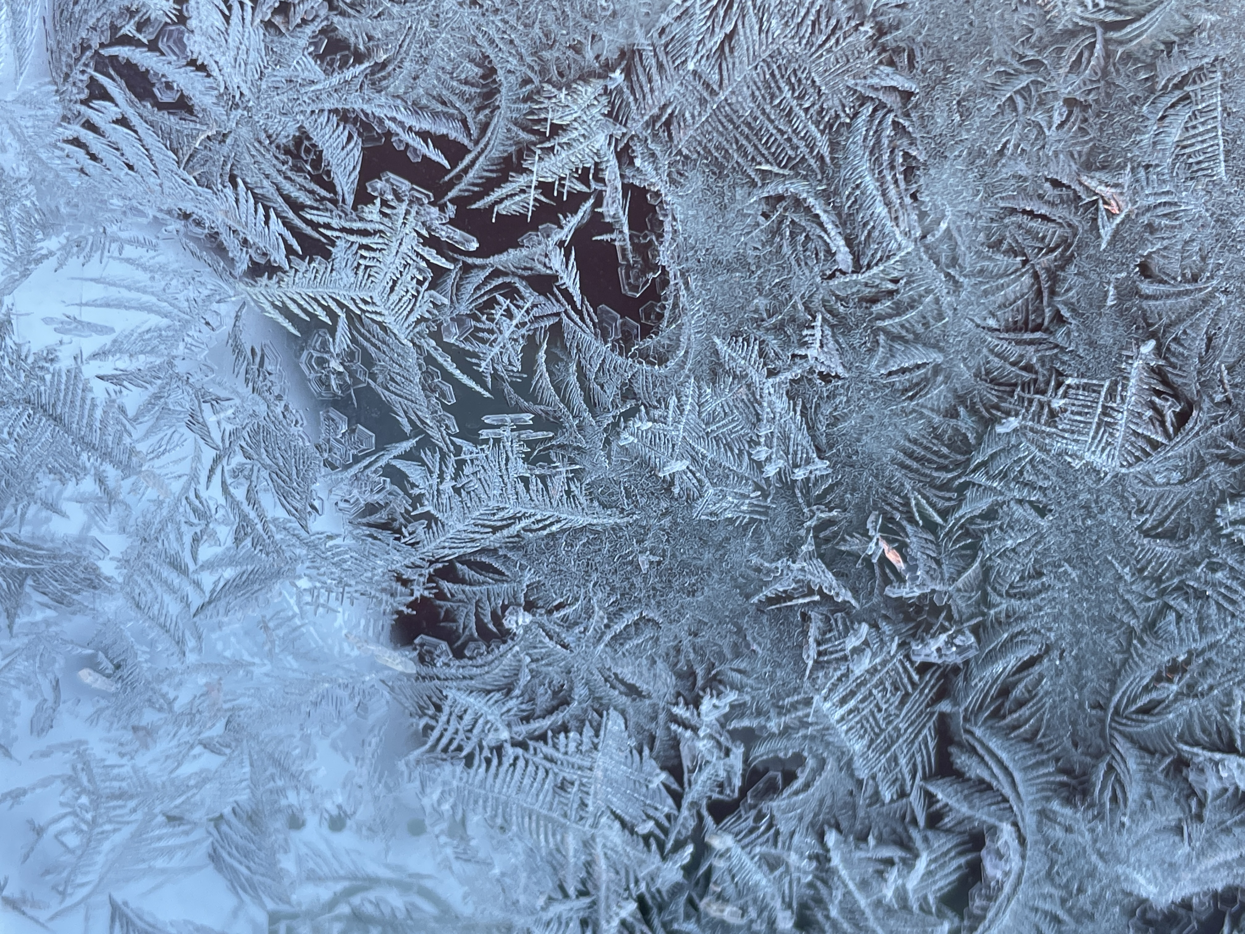 이날 아침 차의 유리에 결정체 그림을 남긴 추위......