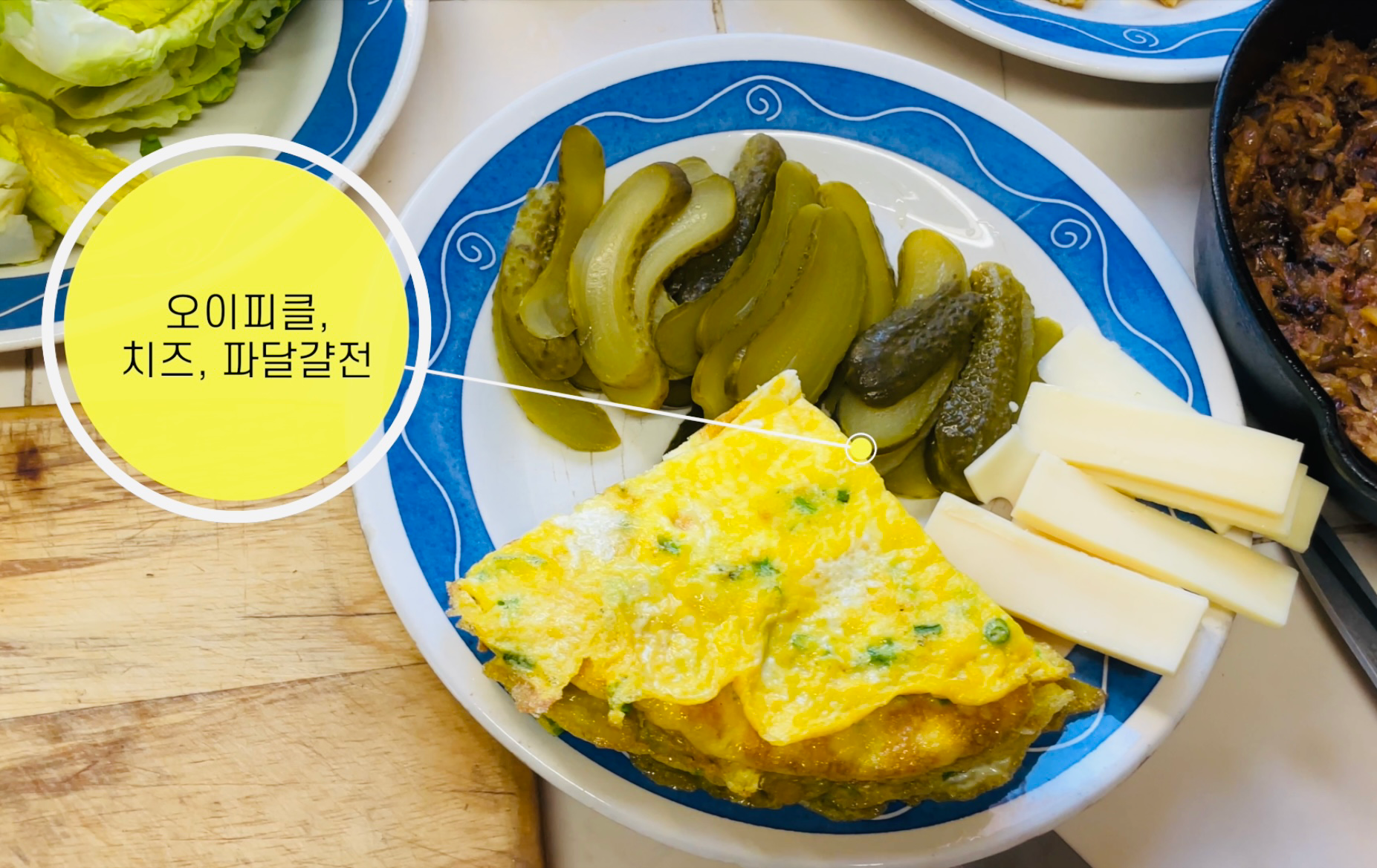 슬라이스하게 잘 자른 오이피클, 치즈, 달걀전......