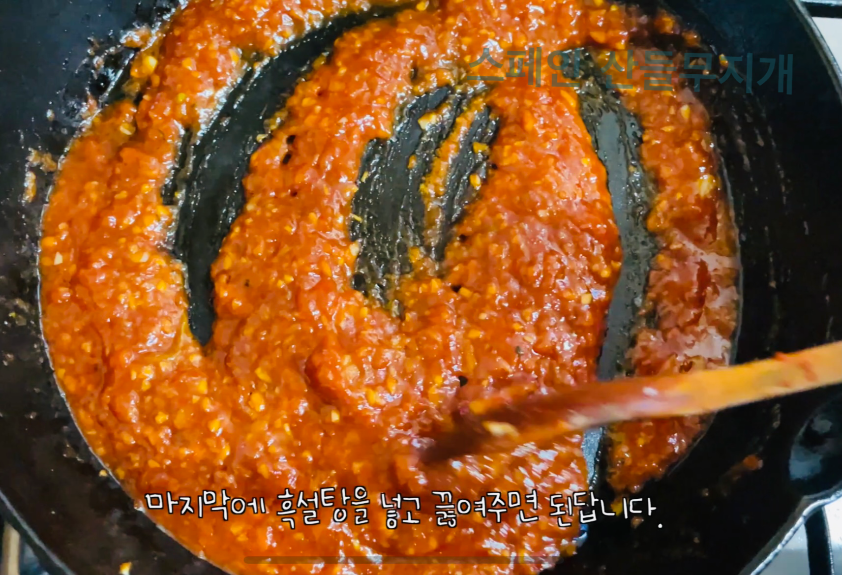 올리브기름 듬북 두른 팬에 넣어 잘 볶아준답니다. 그다음 고추장과 물을 넣고 볶다가, 케첩 넣고, 간장 두세 큰 술 넣어 함께 끓여준답니다. 기호에 따라 양은 각자 조절하시면 된답니다. 마지막에 흑설탕을 넣어 맵고 단 맛을 조절할 수 있고요. 😉