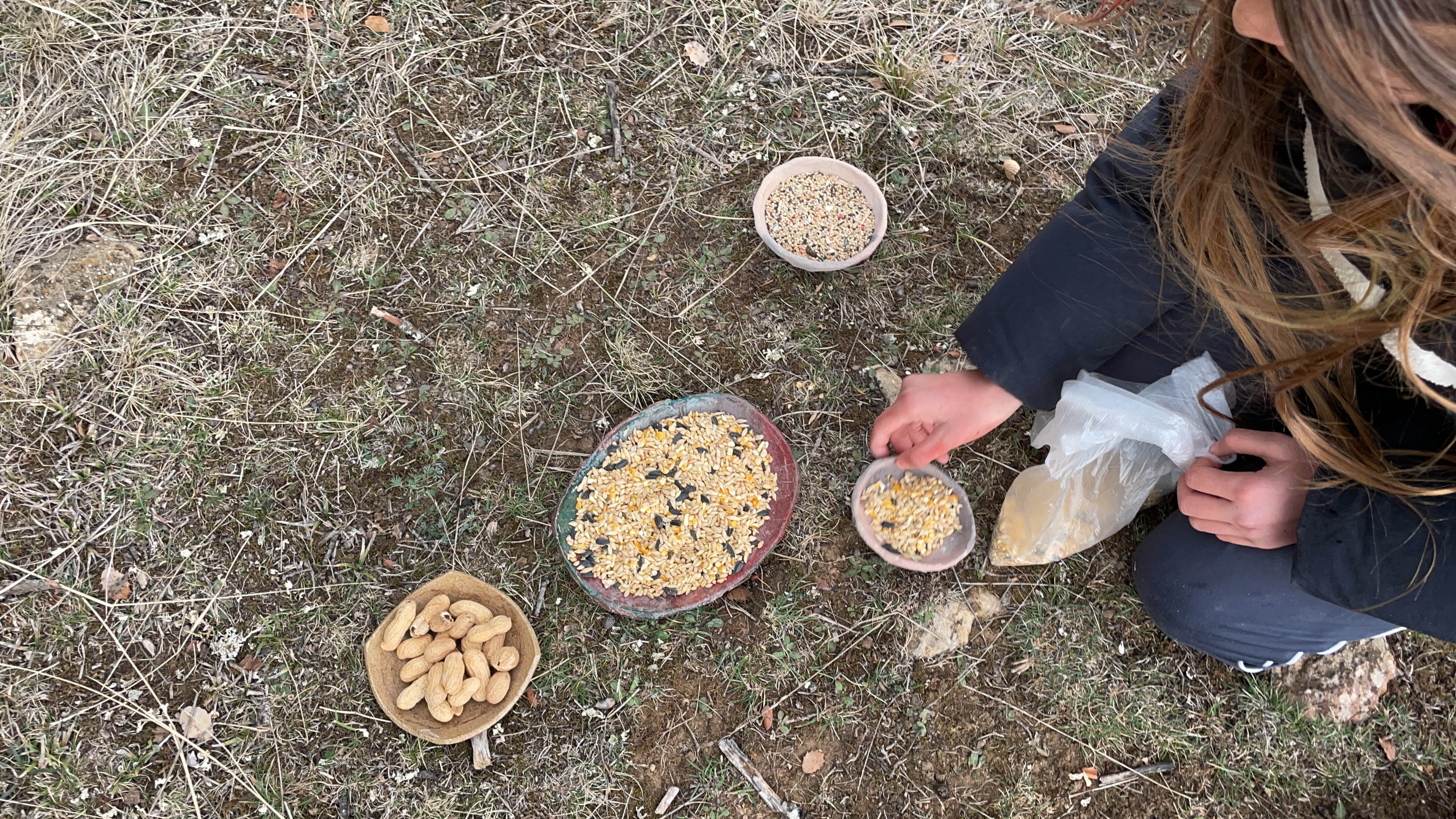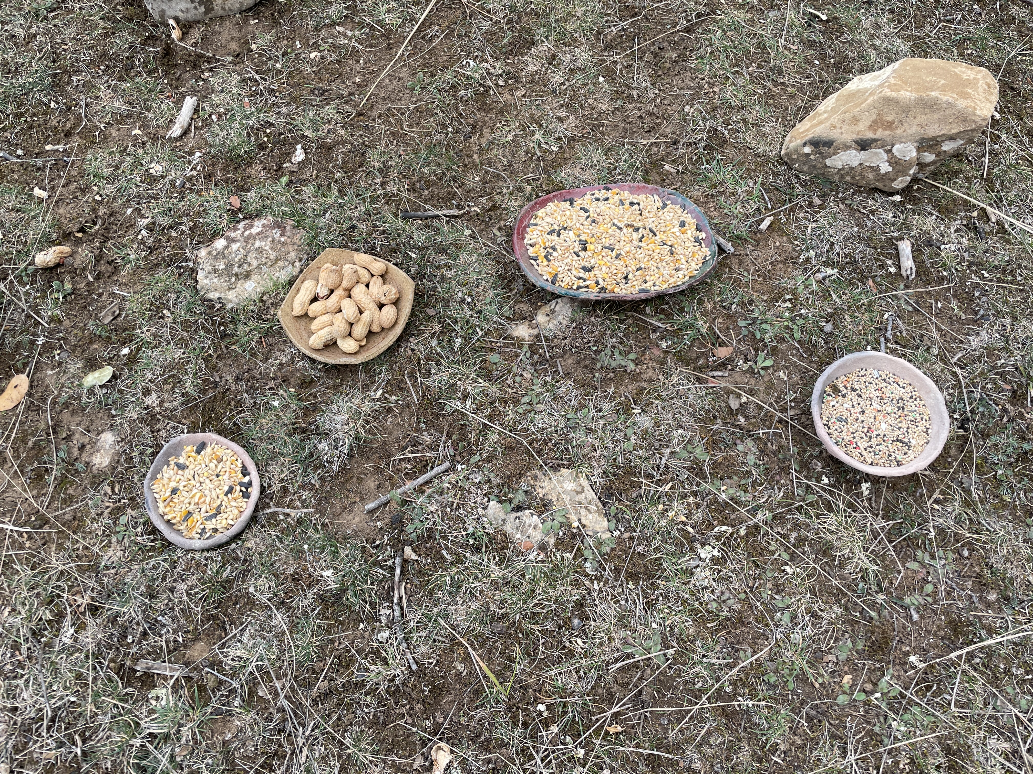 산드라는 꾸준히 새를 관찰하지만, 비가 내리지 않는 가뭄에는 동산 곳곳에 물그릇을 갖다 놓기도 하고, 위의 사진처럼 먹이도 곳곳에 두기도 한답니다. 또, 먹이통도 여러 개 만들어 눈 온 날이나 먹이가 흔하지 않는 혹독한 계절에 먹을 수 있도록 나무에 매달아놓기도 하지요.