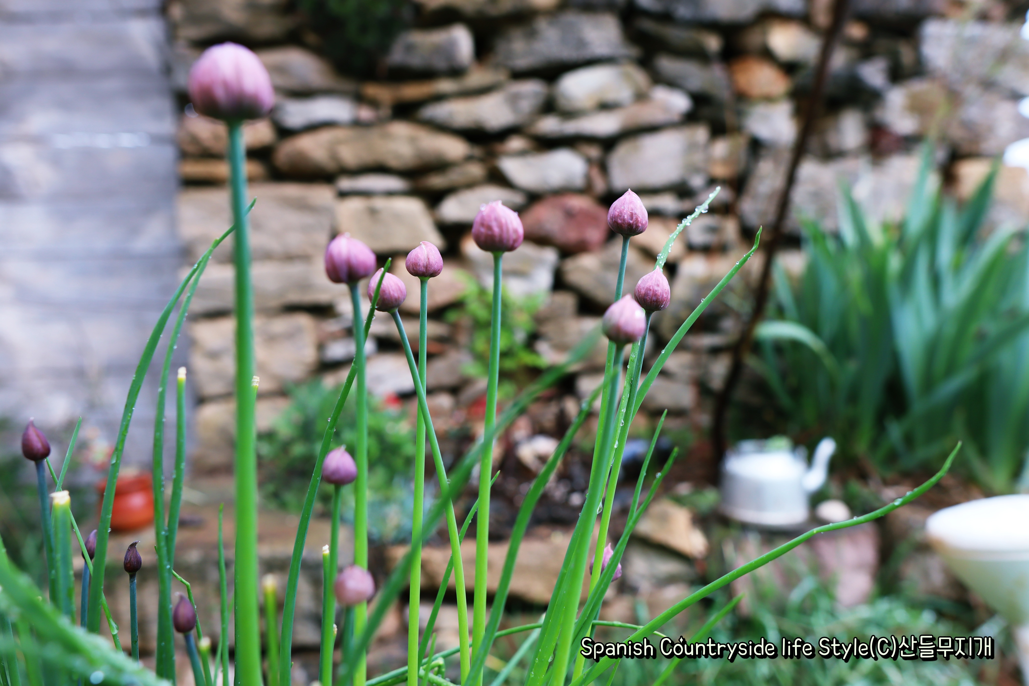 쪽파의 꽃봉오리도 올랐다!!! 양 떼가 와 잡수셨는데 아랑곳 않고 예쁜 꽃대를 올렸다. 뭐, 나도 가끔 잘라먹는데, 양 떼라고 차별하는 것도 아니고...... 연보랏빛 꽃이 예쁘다.