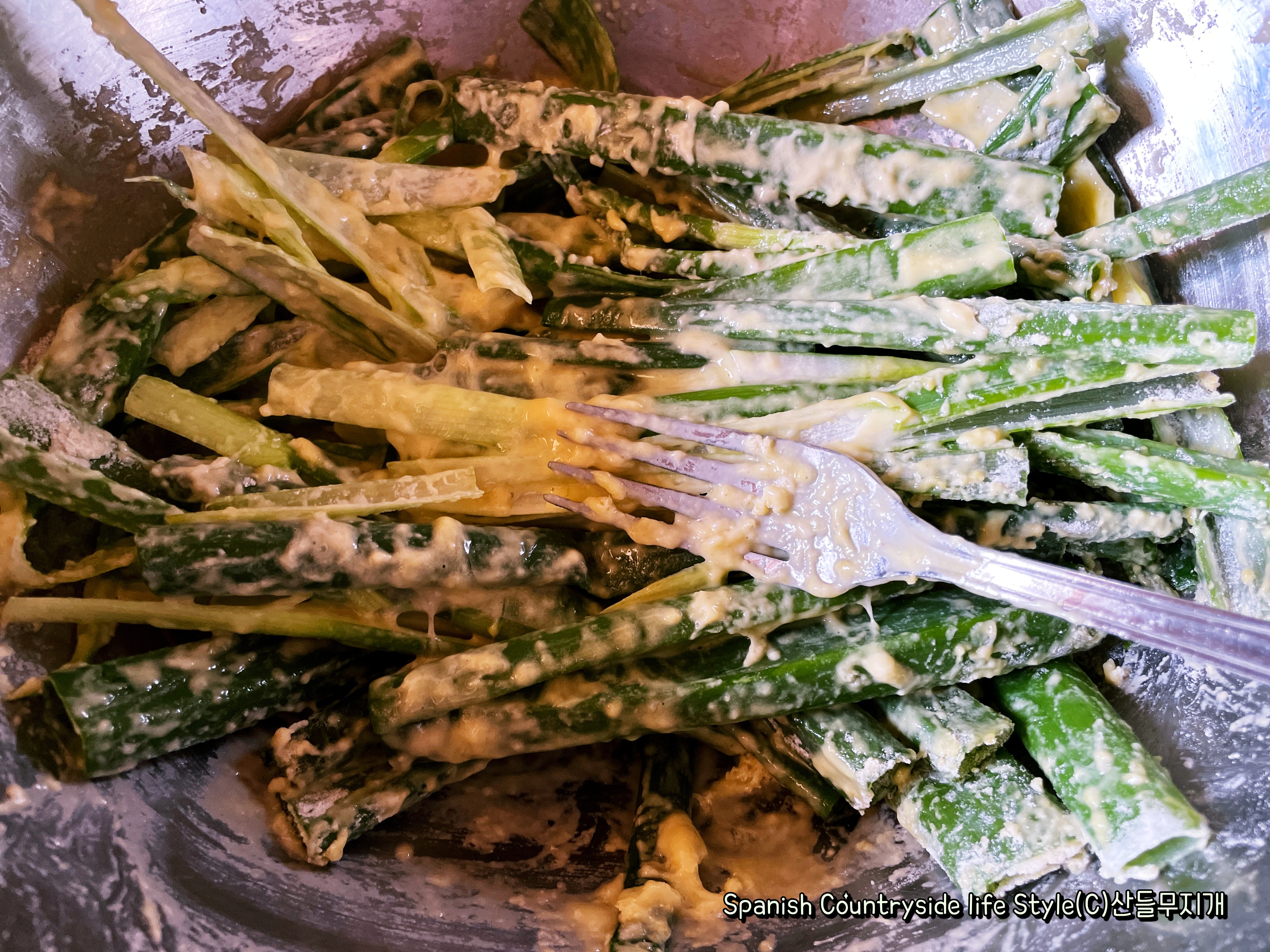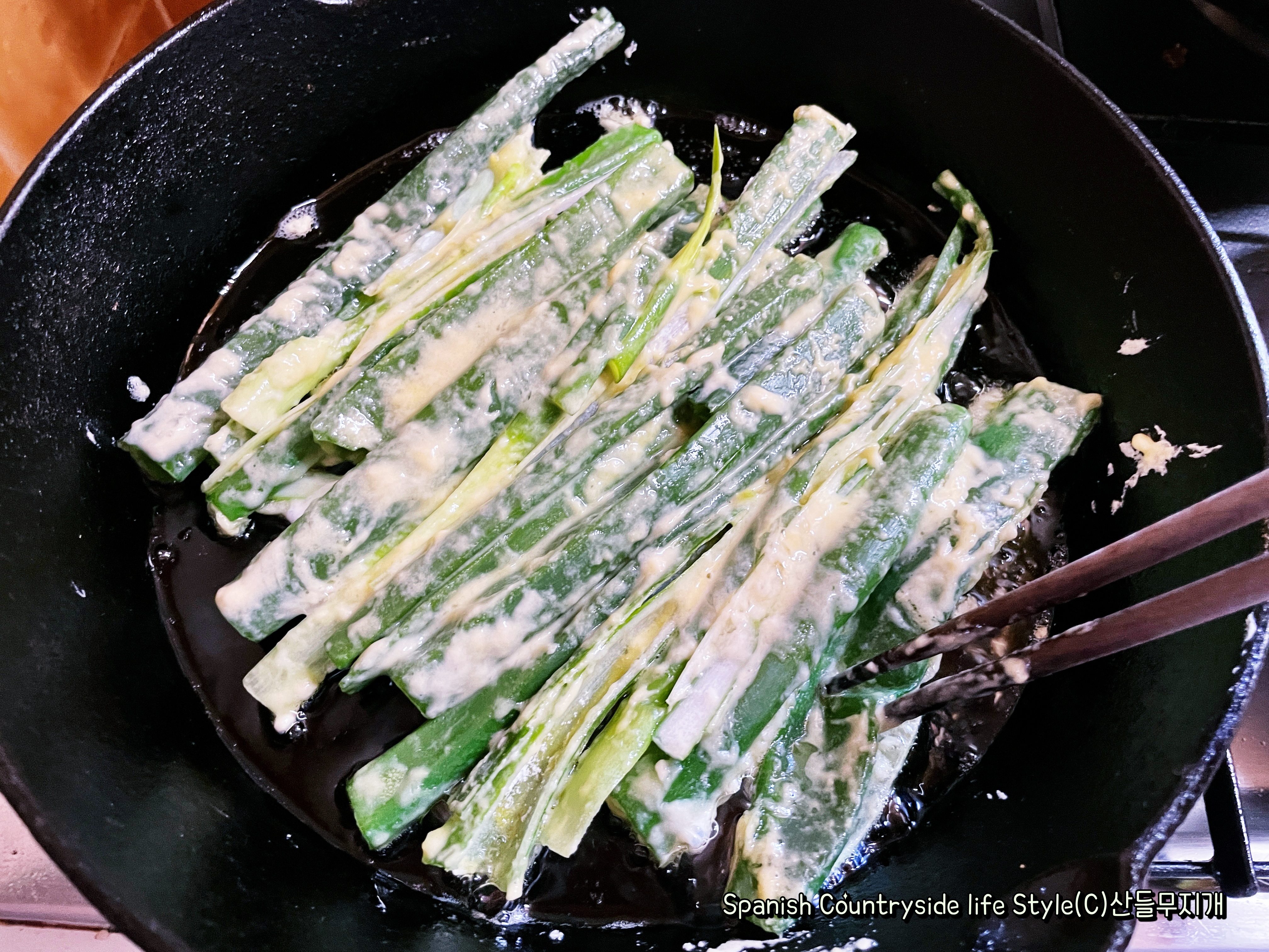 파를 적당하게 자른후, 굵은 부위는 반으로 갈라 어느 정도 가늘게 해 주고요, 달걀과 밀가루, 소금, 물 조금 적당히 넣어, 반죽이 거의 없을 정도로 꾸덕꾸덕하게 해 주면 된답니다.