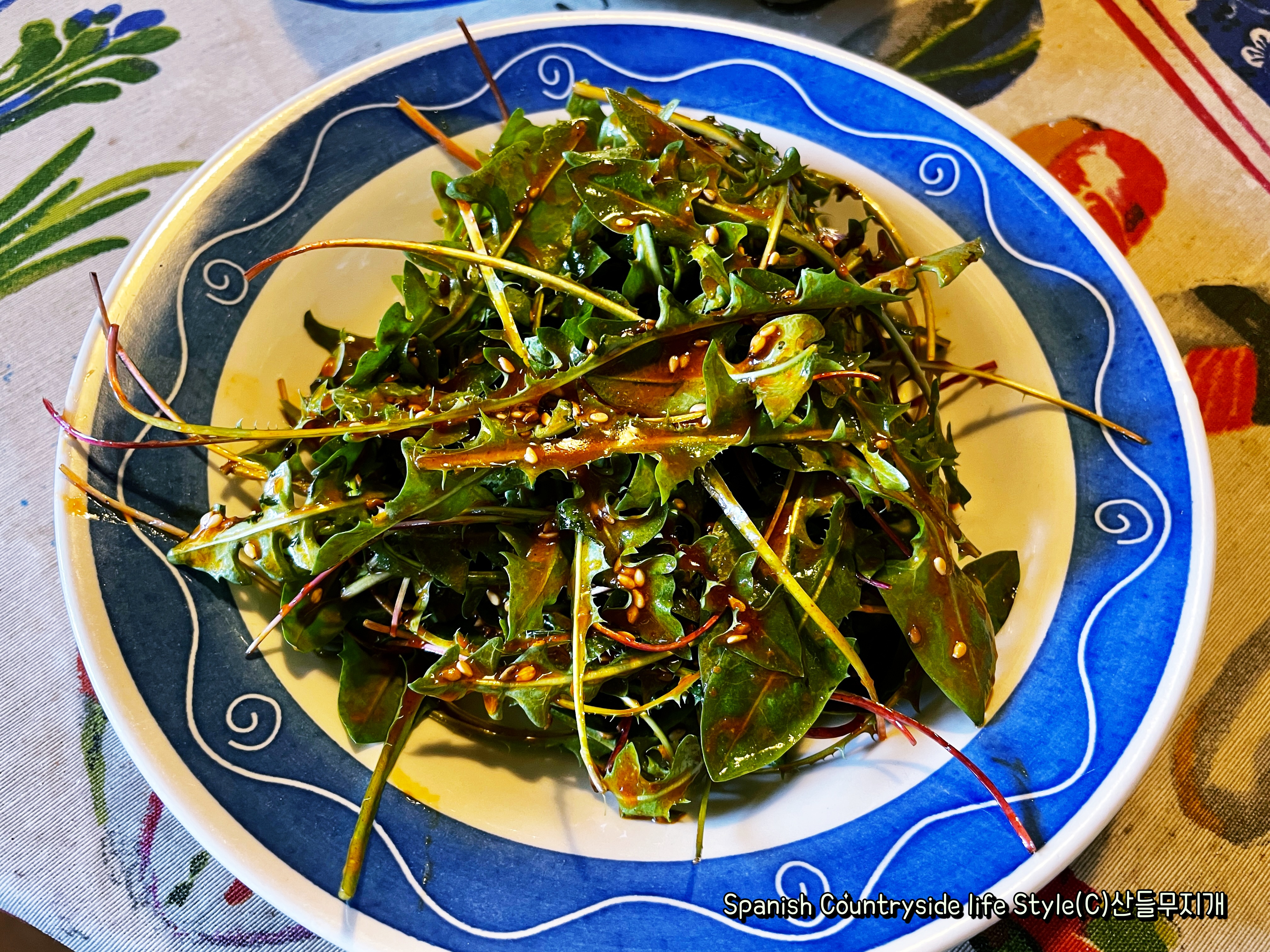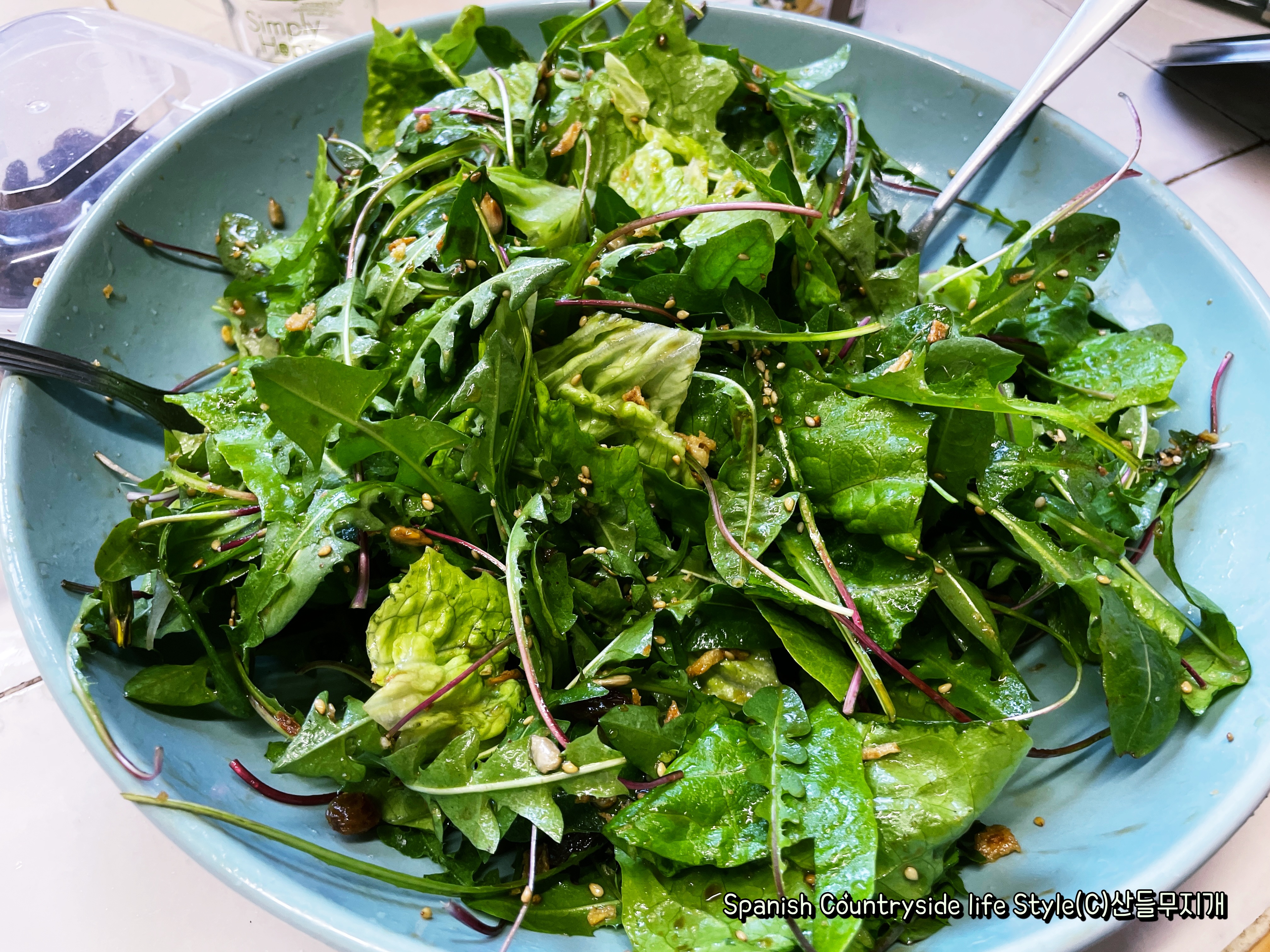 위의 사진은 민들레잎민들레 잎 샐러드인데요, 이 샐러드는 상추와 민들레 잎을 섞은 후, 견과류를 넣어 발사믹 식초, 엑스트라 버진 올리브기름, 소금을 넣어 마무리해 드시면 아주 맛있답니다. 사라는 이 샐러드에 건포도를 넣었는데 건포도와 호두 등의 견과류를 넣어도 참 맛있더라고요. 물론, 샐러드의 단맛을 싫어하는 분들에게는 비추입니다. ^^