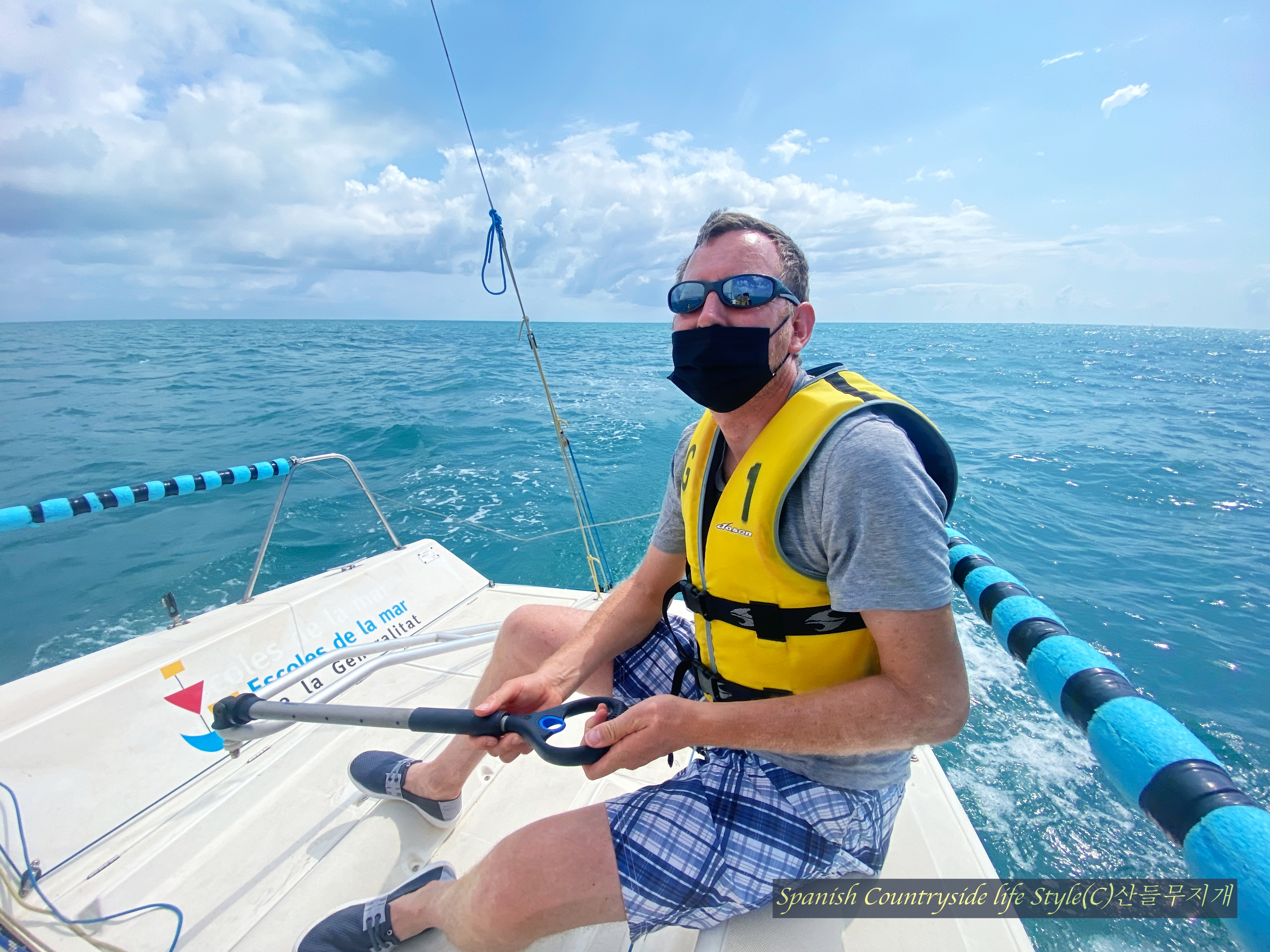 일단, 발렌시아 정부에서 운영하는 바다 학교는 두 군데 있습니다. 관광 휴양도시인 베니카심(Benicassim)에 하나, 또 하나는 부리아나(Burriana)라는 지중해 연안의 작은 항구 도시에 있지요! 참가자는 만 9세부터 만 99세까지 가능하고요, 운영은 12월과 1월을 뺀 10달 내내 운영한다고 합니다. 보통 5박 6일, 주말, 학교 기준에 따라 하는 훈련 등이 있습니다. 여름에는 자신이 원하는 스포츠를 중점적으로 배울 수 있고, 이벤트 형식은 여러 스포츠를 여러 날 이것도 배워보고 저것도 배워보는 형태로 하고 있지요. 예를 들면 우리 아이들이 부활절 기간에 배운 스포츠는 아주 다양했어요. 세일링, 요트, 윈드서핑, 패들서핑, 카누 등 다양한 스포츠를 배웠지요. 부활절이라는 이벤트를 더해 영어로 가르쳐주는 코스이기도 했지요. 하지만, 이번 여름에는 돛을 올려 방향을 바꿔 이동하는 세일링만 전문으로 배웠답니다.