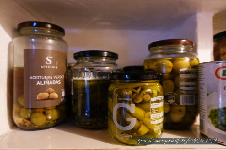 다양한 저장 식품이 이 '음식 저장실' 대표 식품입니다! 올리브 절임과 오이 피클, 고추 피클 등 다양하게 있습니다.