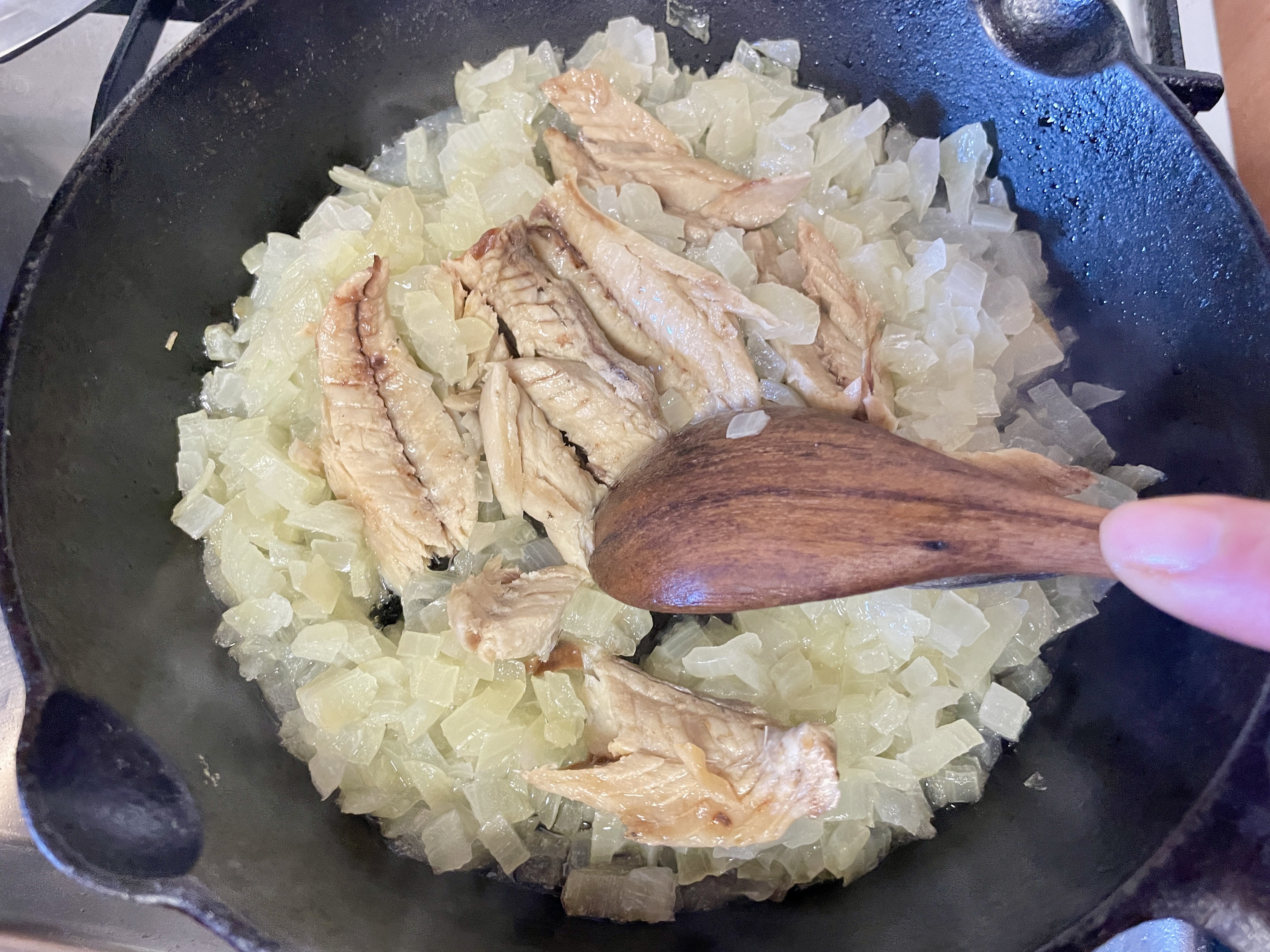 양파가 투명하게 잘 익으면 캔을 따고 고등어를 양파 속에 넣어줘요.