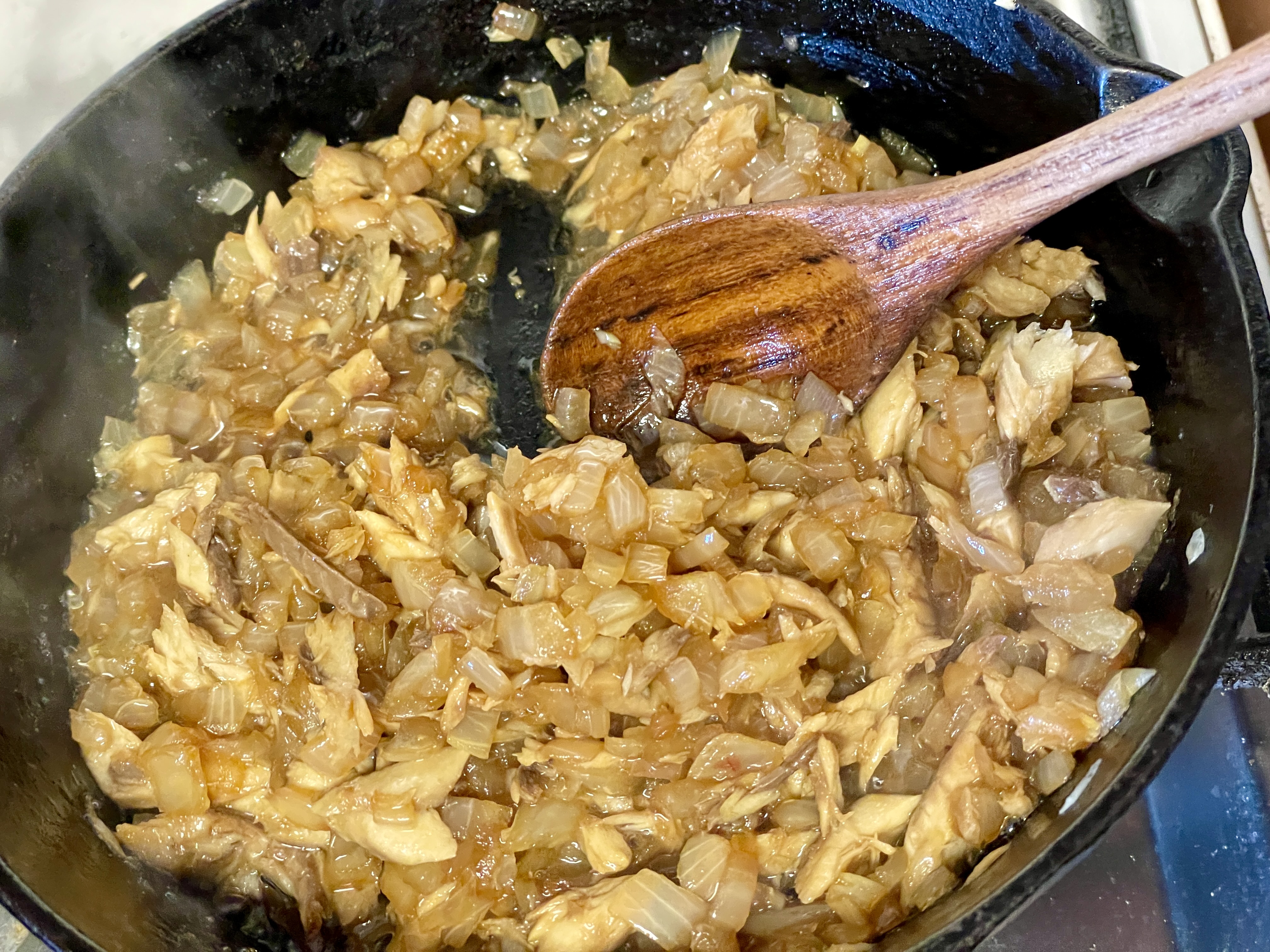 양파가 투명하게 잘 익으면 캔을 따고 고등어를 양파 속에 넣어줘요.