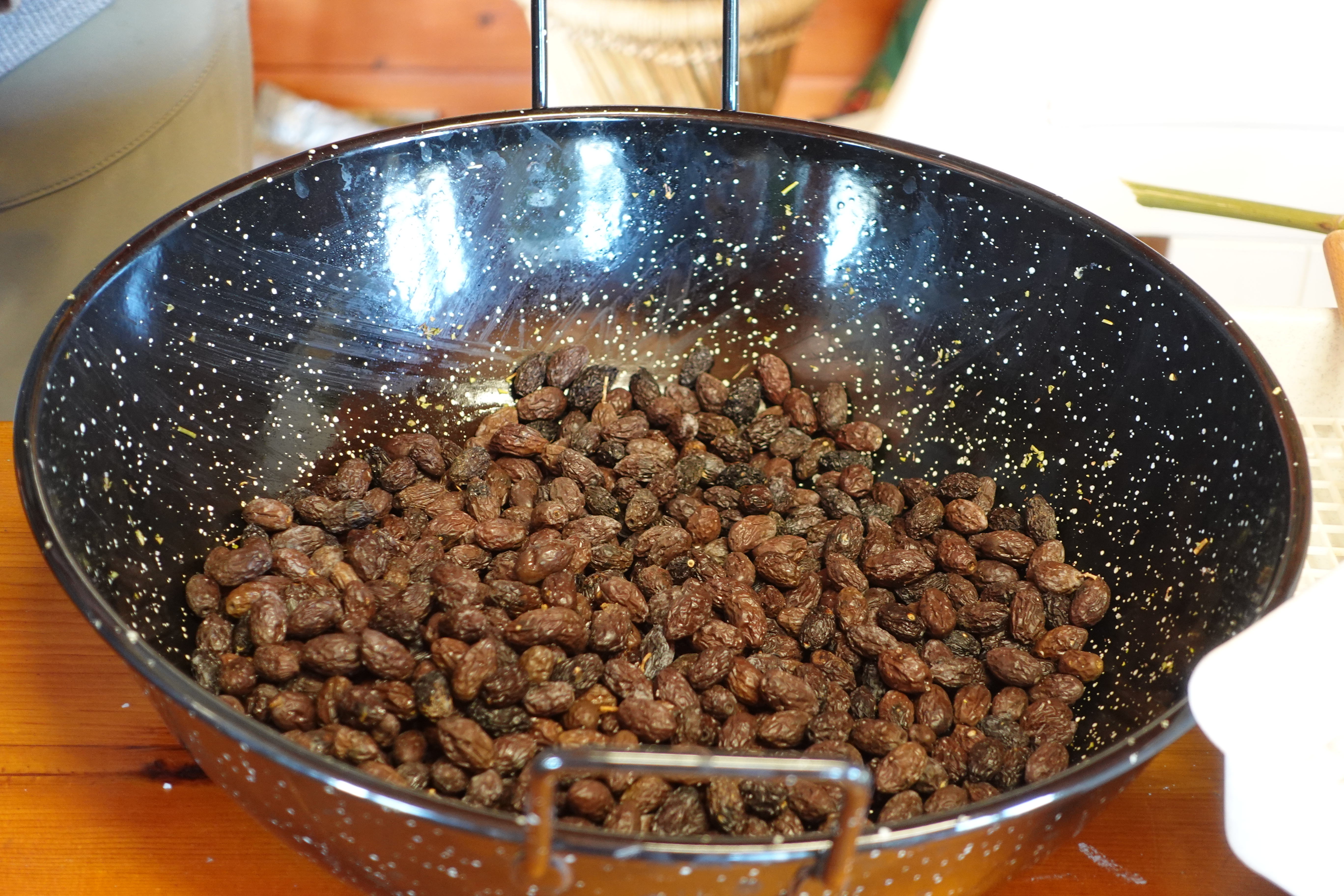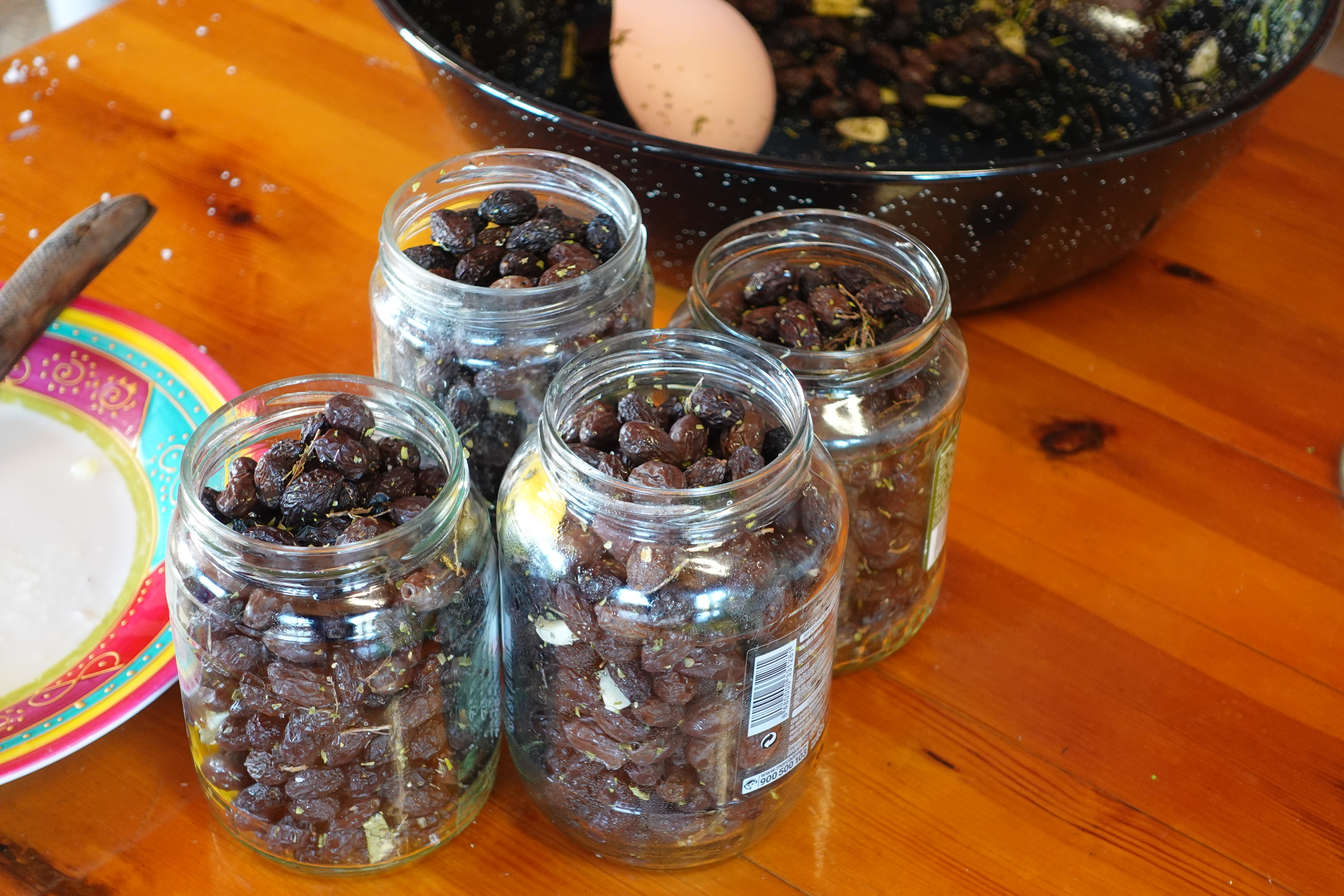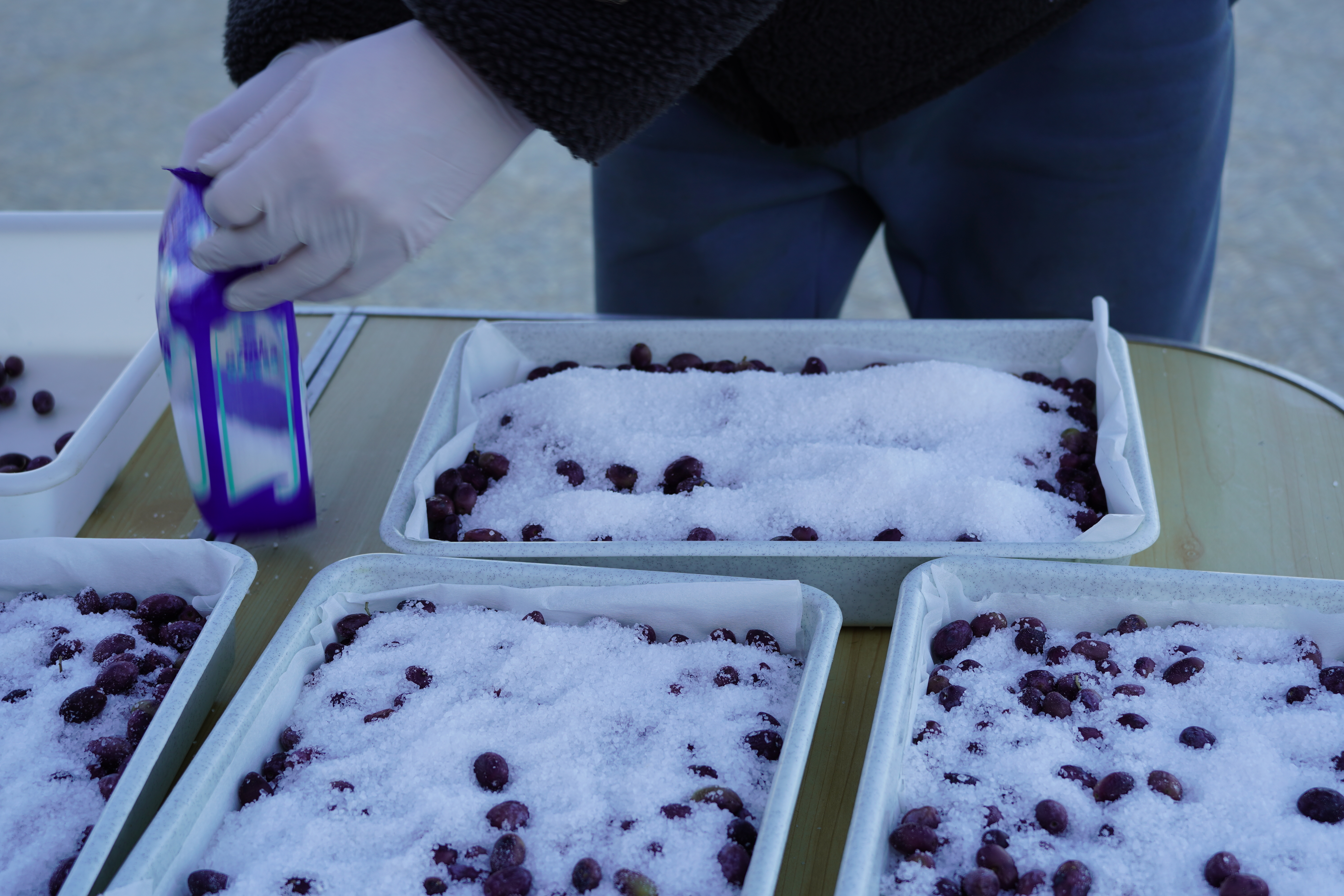 잘 골라낸 올리브는 소금에 잠길 정도로 푹~ 절여줍니다. 저 그릇 아래에 망이 있어서 삽투압으로 빠진 액체가 나가는데요, 육질이 많지 않아 빠지는 액은 별로 없습니다. 이렇게 소금에 절이는 동안은 통풍이 잘 되고 건조한 곳에 놓아둡니다. 우리는 한 달 정도 놓아뒀습니다.