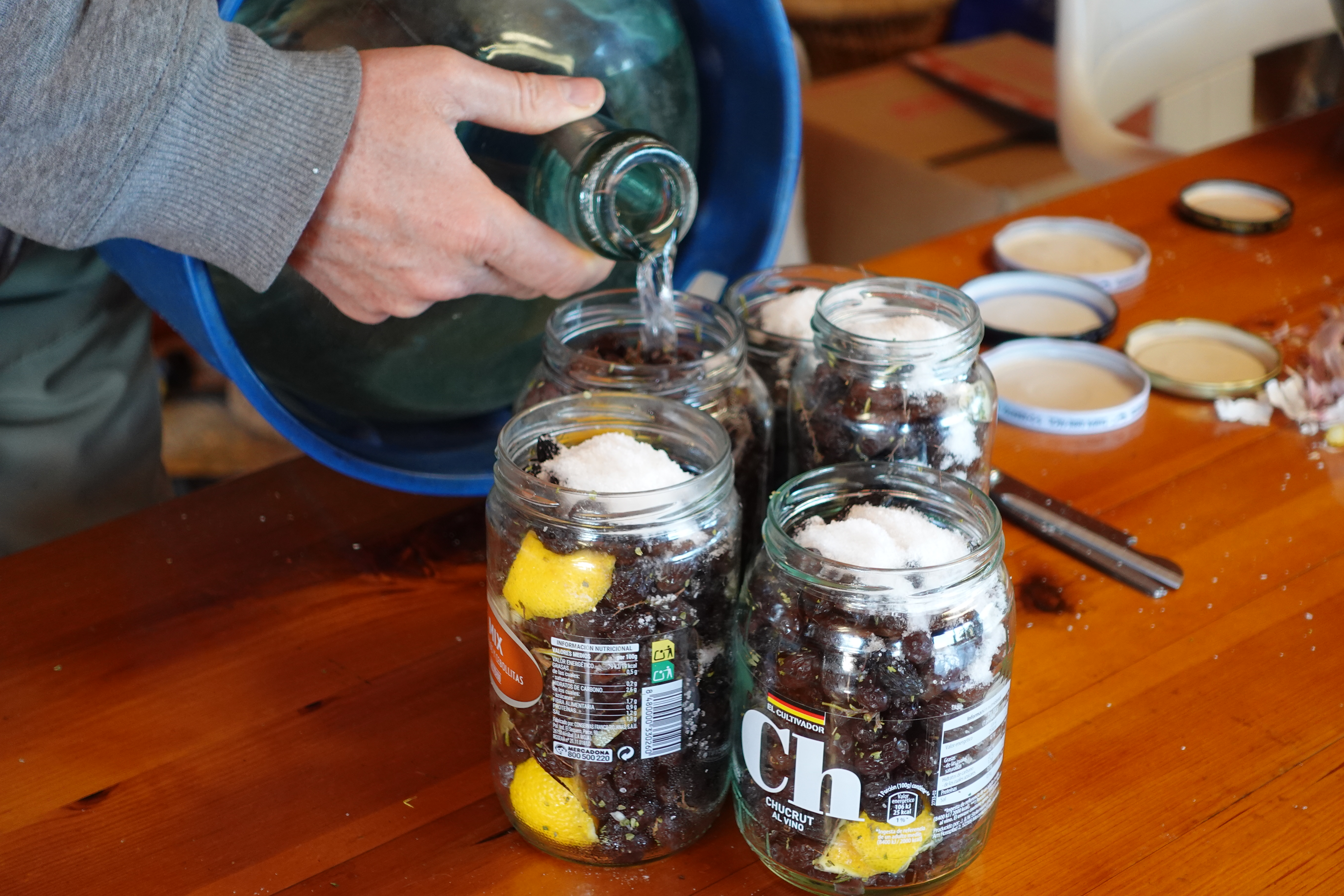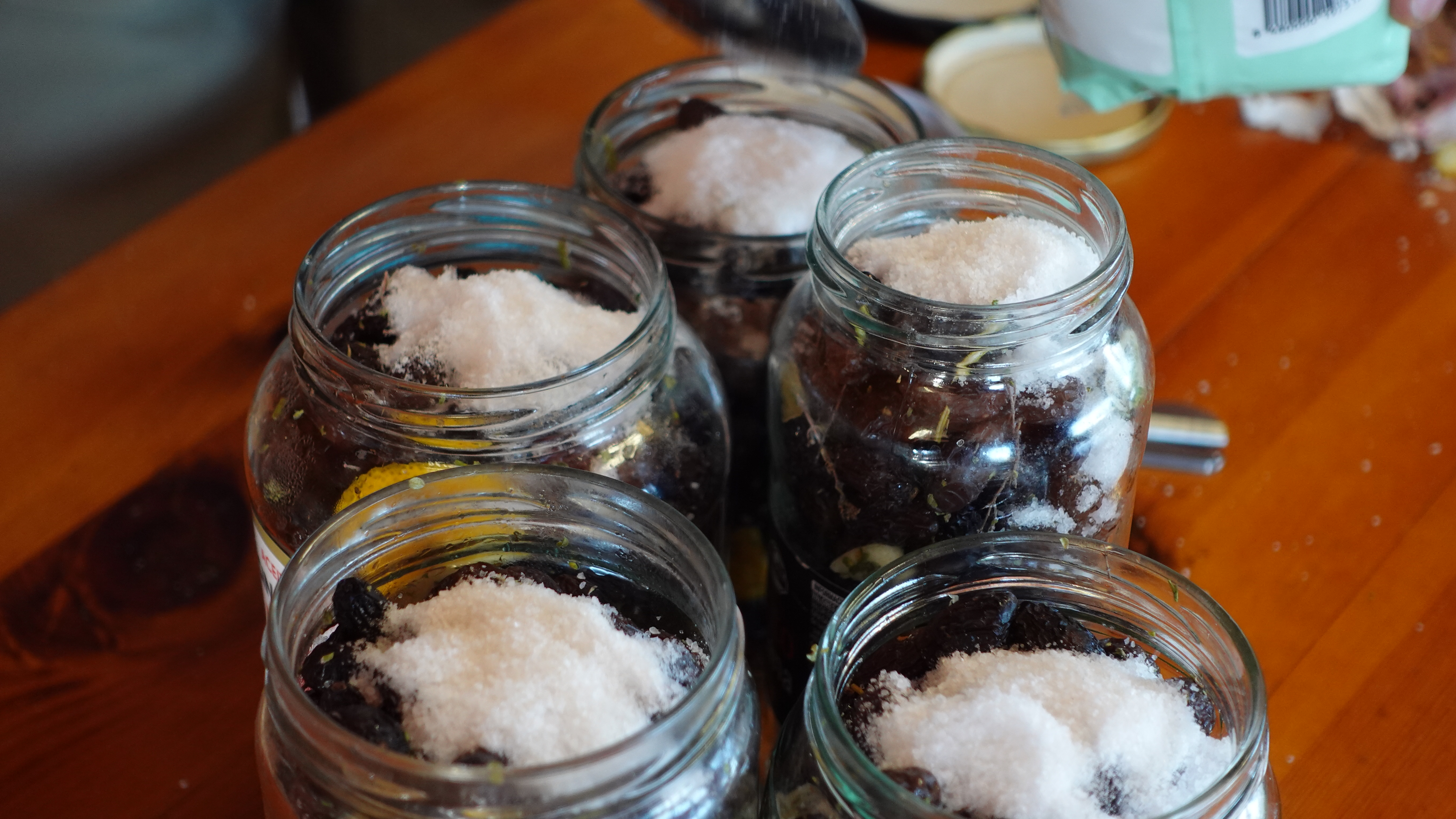 다 된 양념된 올리브열매는 미리 소독한 보관할 병에 넣고, 소금도 잔뜩 넣습니다. 이것도 염장의 일종이기에...