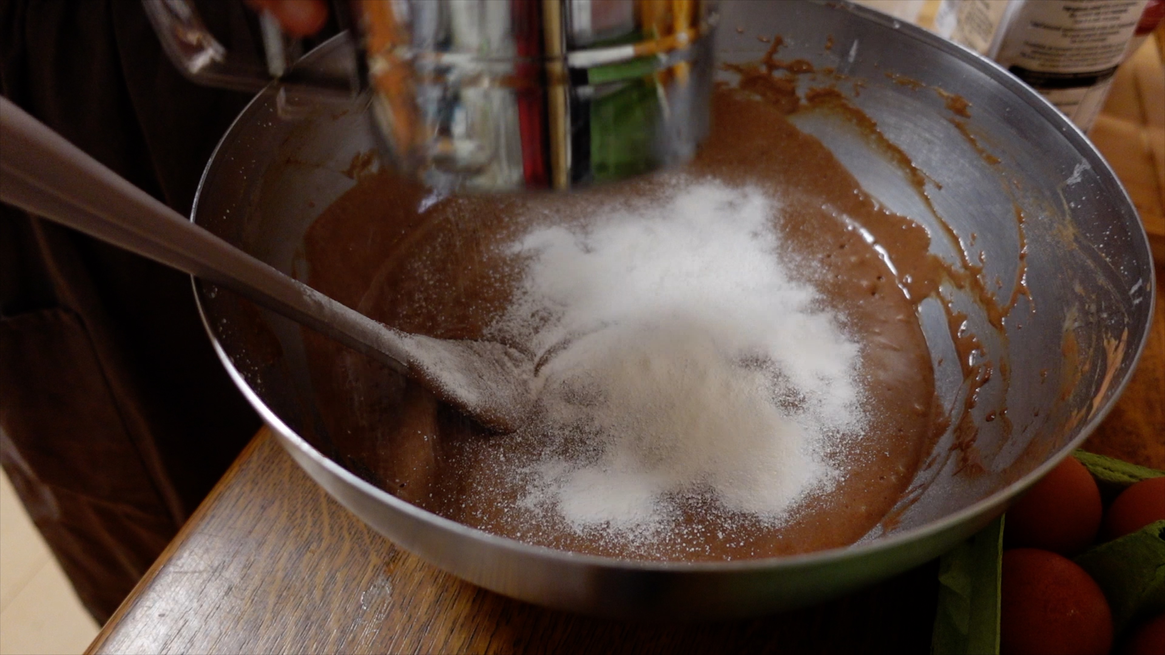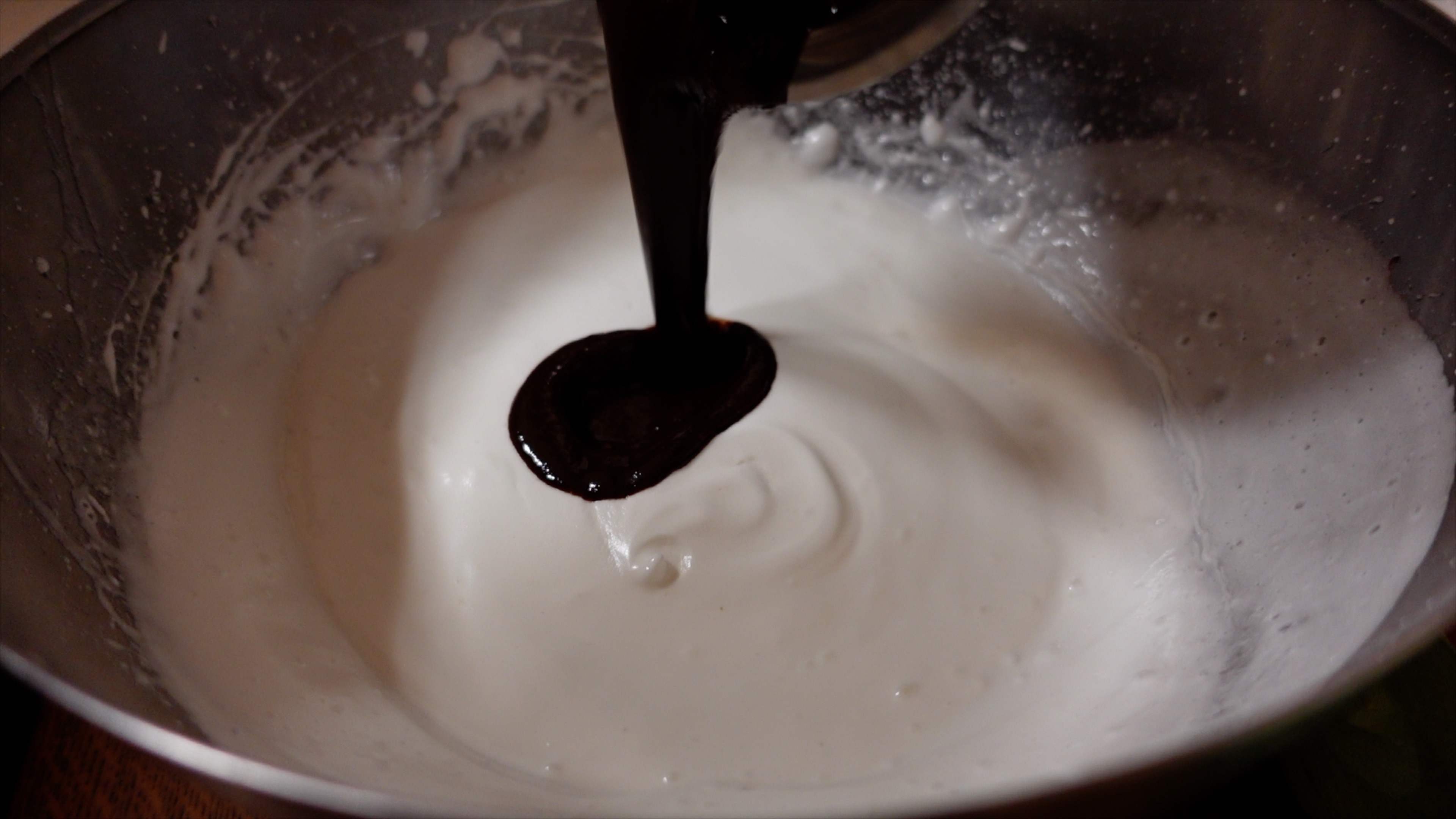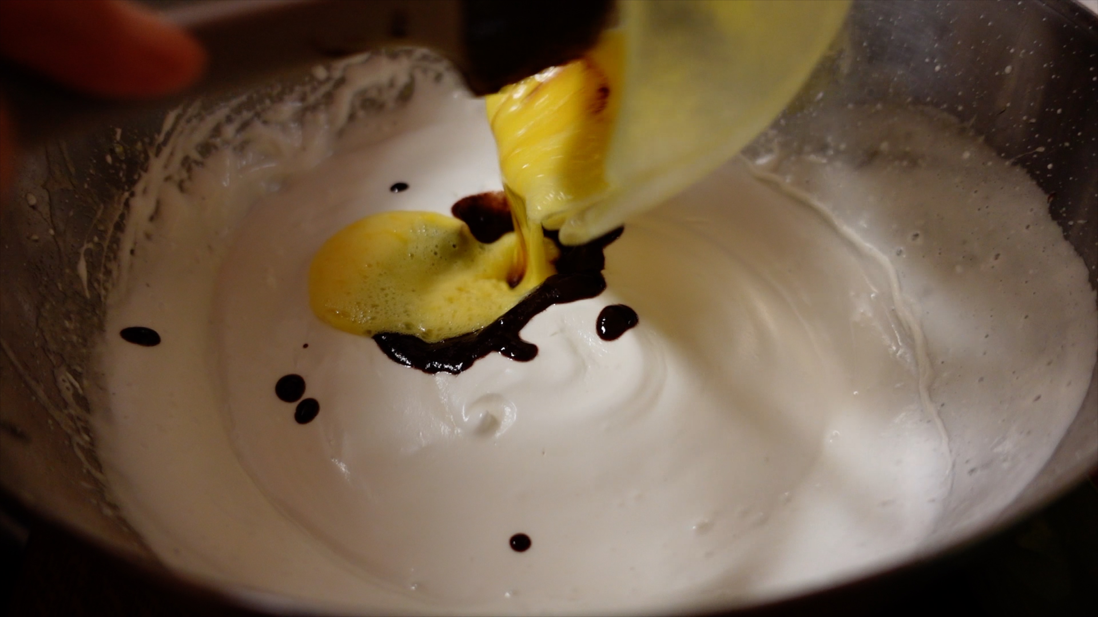 이제 휘핑된 흰자, 머랭 위에 녹인 초콜릿 + 버터, 그리고 풀어준 노른자를 넣은 후, 주걱으로 아래서 부터 부드럽게 섞어줍니다.