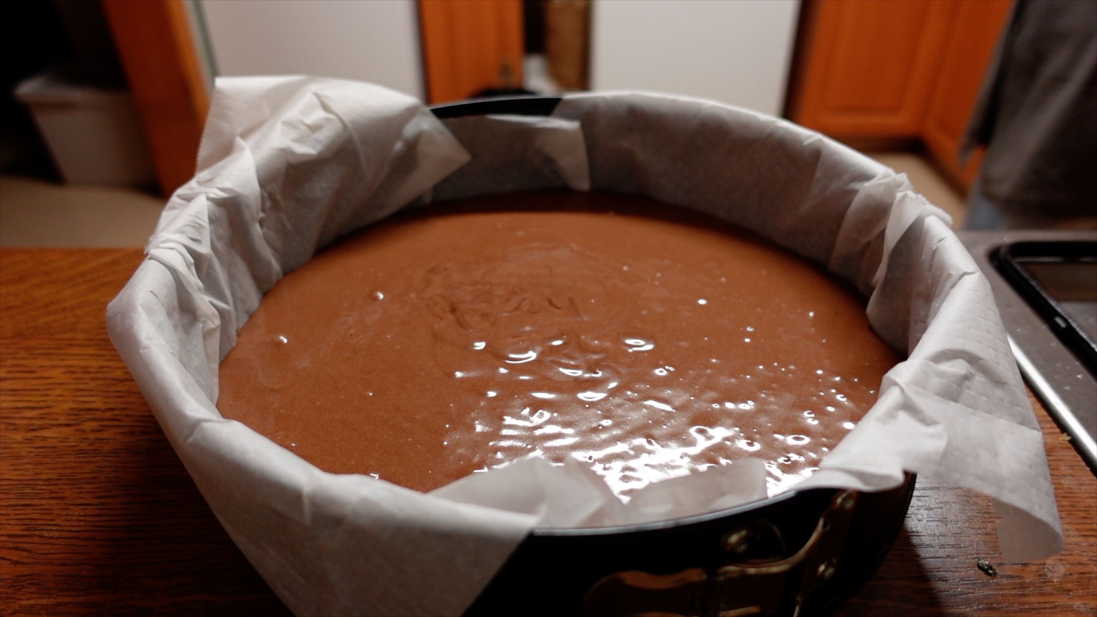 굽기 전에 부드럽게 틀을 바닥에 쳐서 약간의 공기를 빼줍니다.