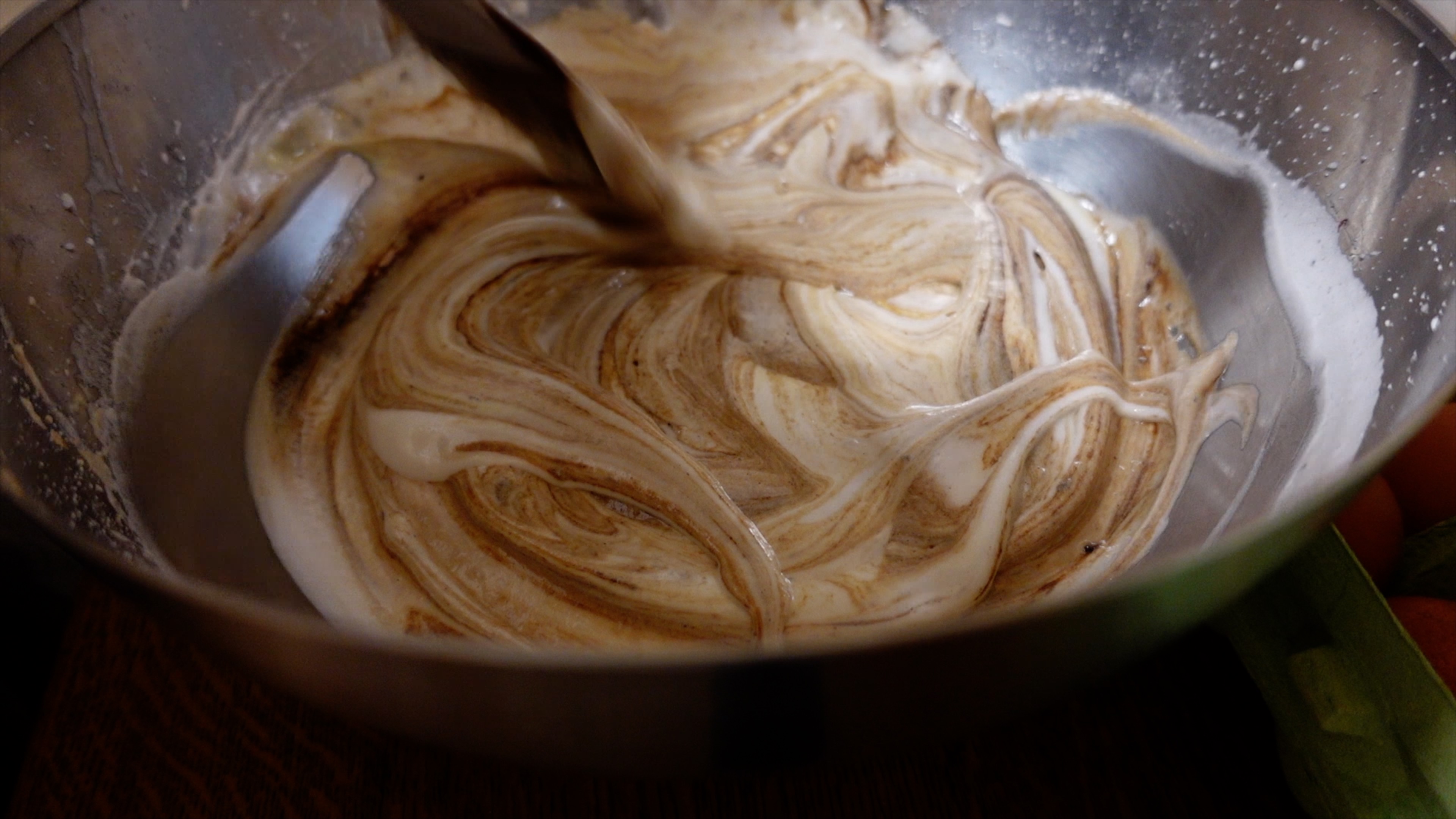 이제 휘핑된 흰자, 머랭 위에 녹인 초콜릿 + 버터, 그리고 풀어준 노른자를 넣은 후, 주걱으로 아래서 부터 부드럽게 섞어줍니다.