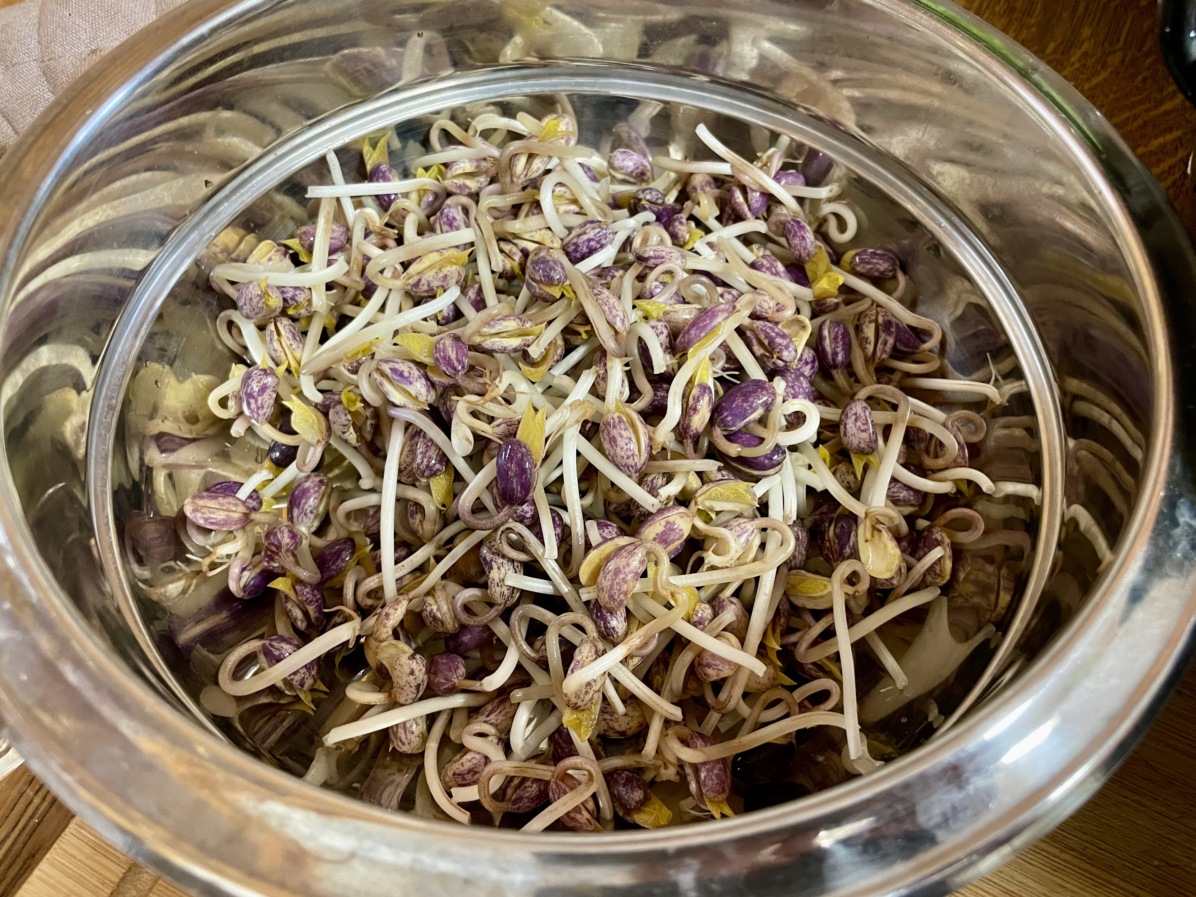 콩 많이 자랐습니다! 그런데 조금씩 잎도 보이는 것 같아 그냥 먹기로 했습니다. 잔 뿌리가 너무 많아 물을 많이 준 건가? 싶기도 하고, 그렇게 죽죽 길게 자라지 않는 걸 보니 아직 덜 자란 것 같기도 하고... 제가 생각하던 그런 콩나물은 아니었습니다. 콩 색깔이 팥에 가까워 좀 놀란 콩나물이었습니다.