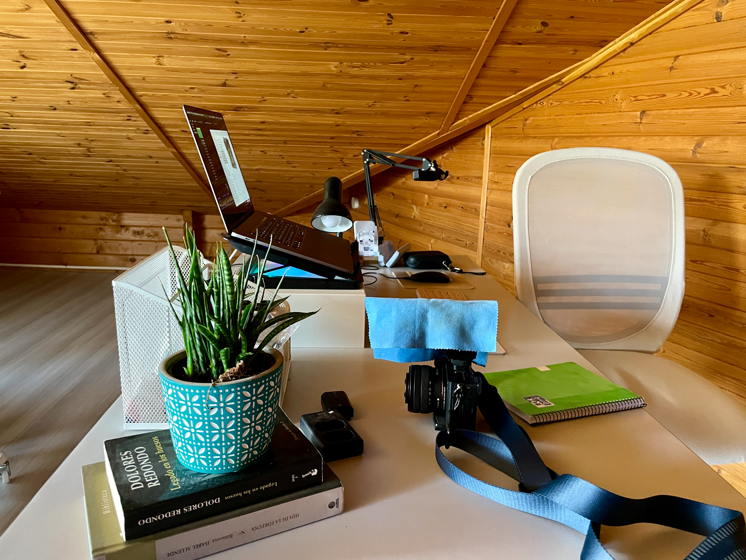 다락방 한쪽에는 내 책상과 컴퓨터가 자리 잡고 있습니다. 여기는 나의 사무실이자 생각의 공간이지요. 키보드를 두드릴 때마다 머릿속에서 맴돌던 생각들이 차곡차곡 정리되고, 화면에 단어로 찍혀 나올 때의 뿌듯함은 이 공간만이 줄 수 있는 특별한 기쁨입니다. 영상 제작할 때는 이 공간이 주는 집중력이 얼마나 대단한지 몇 시간이 흘러도 몇 분밖에 지나지 않은 듯합니다. 책상 위에는 좋아하는 책 한 두 권과 자주 쓰는 물건들이 가지런히 놓여 있습니다. 되도록 책상은 깨끗하게 정리하고 시야의 분산이 일지 않는 물건들로 놓아둡니다.