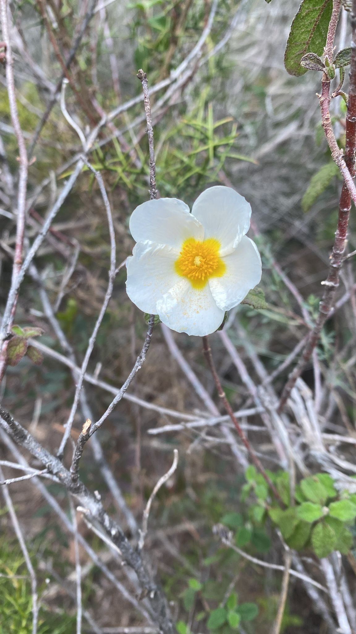 위 사진의 꽃도 시스투스꽃입니다. 앞의 분홍색 색깔과 완전히 다르지요? 꽃잎이 다섯 장, 노란색의 중심부가 특징입니다.