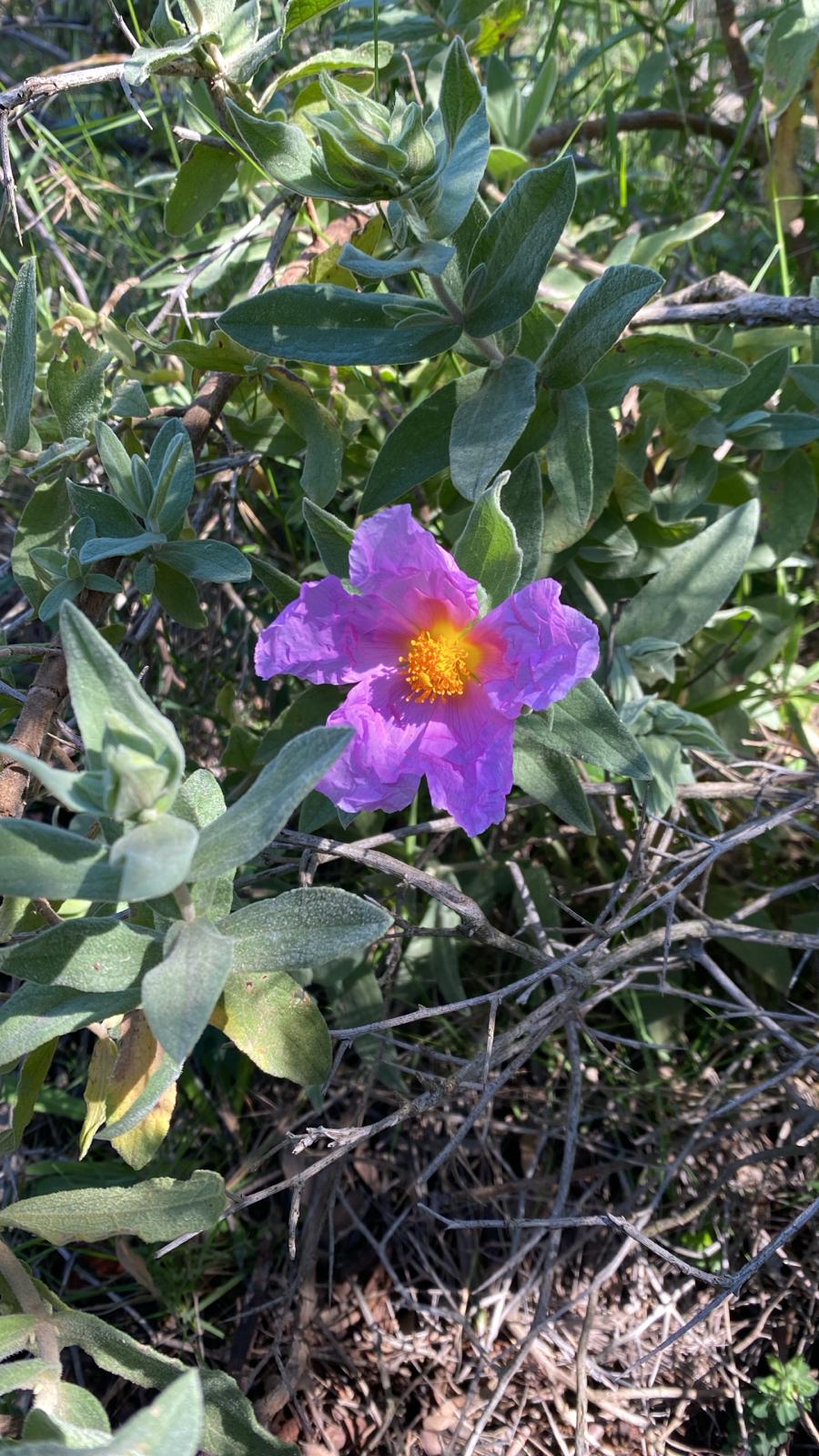 오늘은 산책하다 집 뒤쪽 자갈이 많은 능선에서 문득 눈길을 사로잡은 꽃을 봤습니다. 연보랏빛 꽃잎이 종이처럼 살짝 구겨진 듯한 질감을 띠고, 중심부에는 태양을 머금은 듯한 노란빛이 퍼져 있었습니다. 바위틈에서도 강인하게 피어나는 이 꽃, 바로 바위 장미(Cistus), 시스투스입니다.