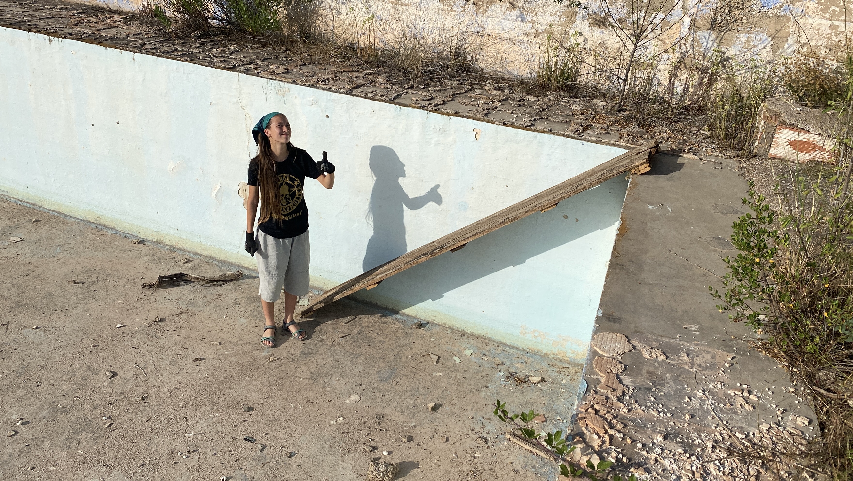 마침내, 산드라는 아빠의 도움을 받아 완성한 경사로를 들고 방치된 수조로 향했어요.