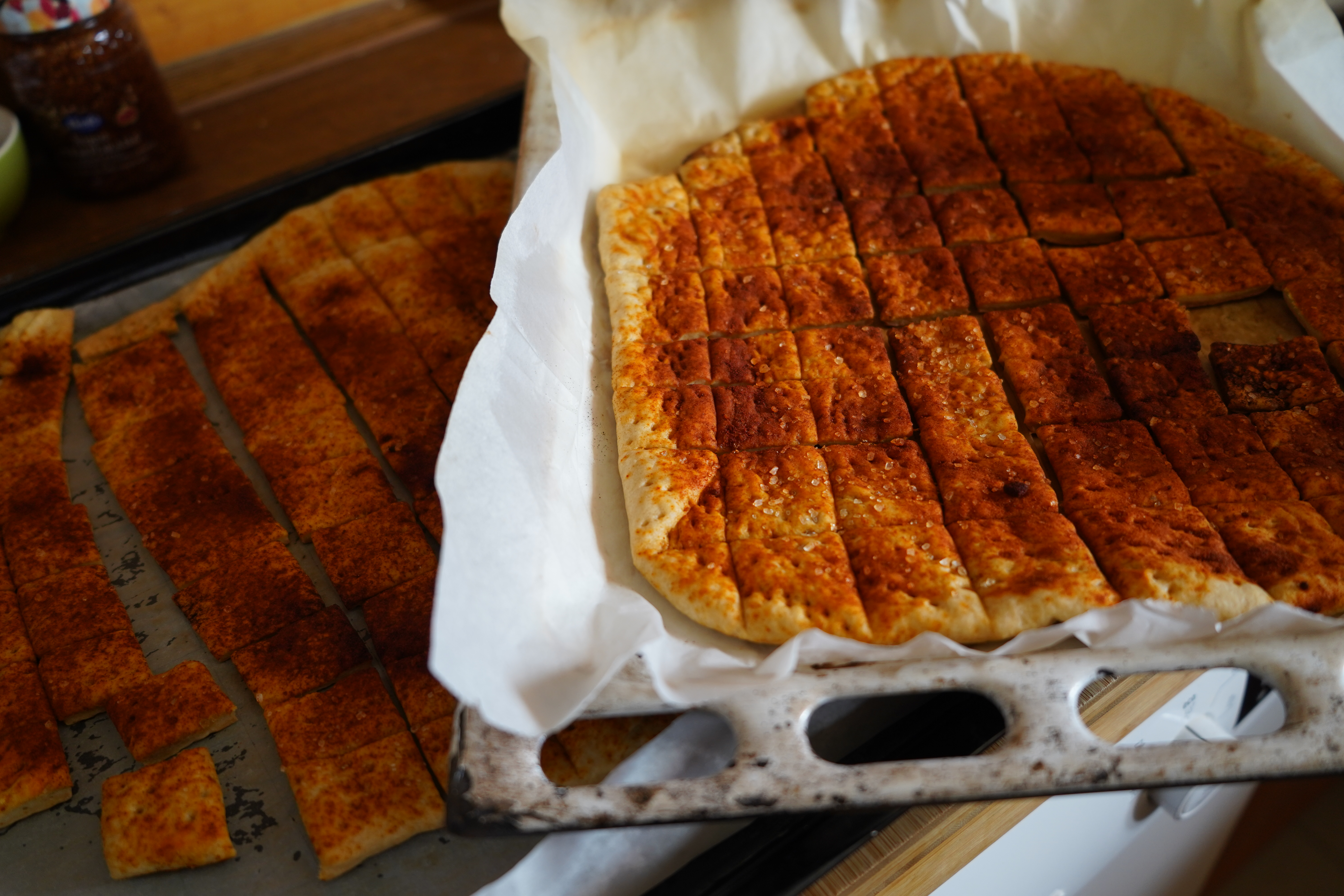 짜잔~ 오븐에서 나온 코카 데 페브레스! 바삭하고 짭조름한 게 아주 맛있네요. 스페인식 건빵이라고 해도 될 정도로 약간의 건빵 스타일인데 고춧가루와 비슷한 파프리카 가루를 뿌려서 계속 먹어도 느끼하지 않고 자꾸 중독되는 맛을 주네요. 자꾸 손이 뻗쳐서 배고플 때 먹으면 멈출 수가 없는 게 함정이랍니다.