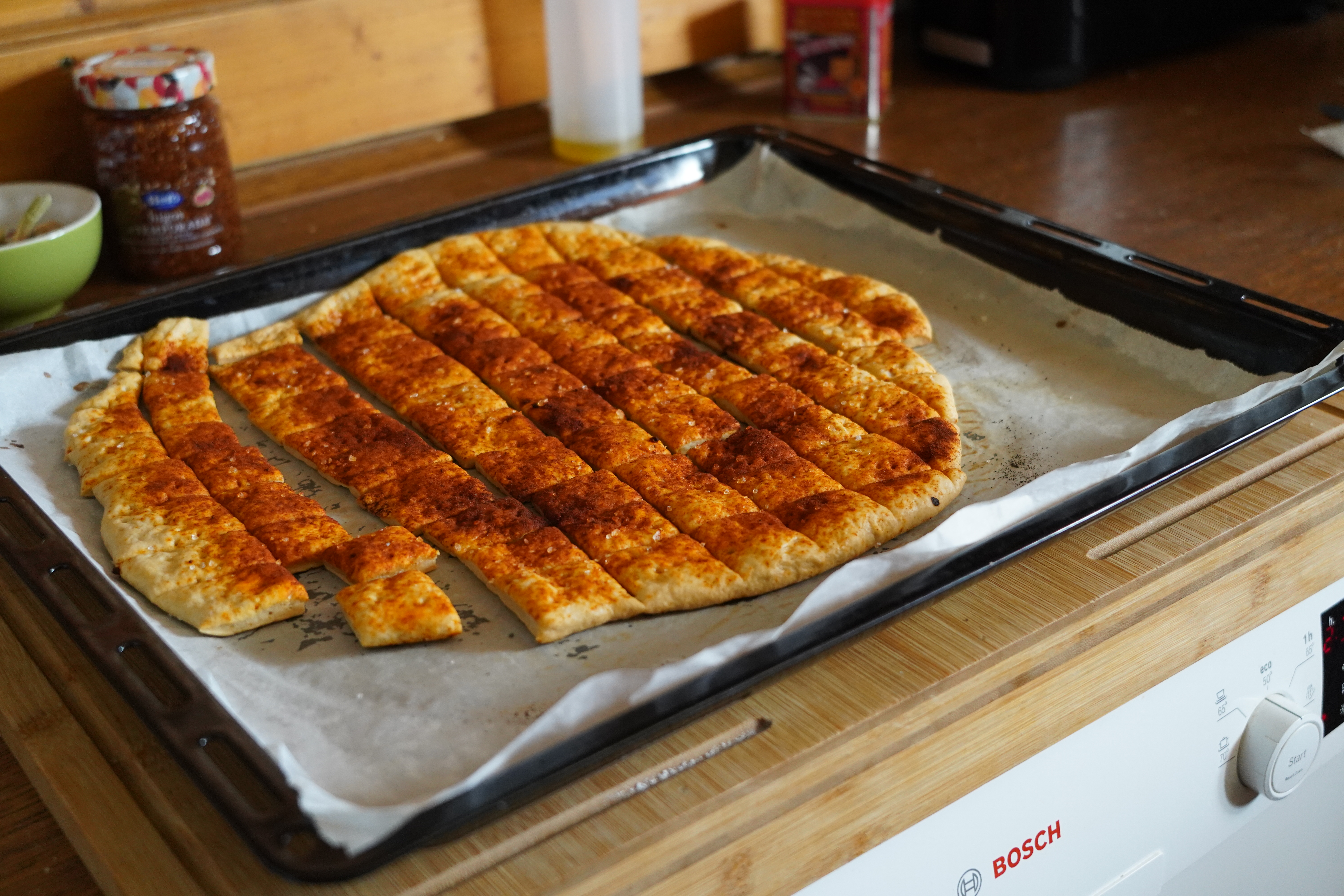 반죽 후 올리는 재료: 파프리카 가루, 굵은 소금