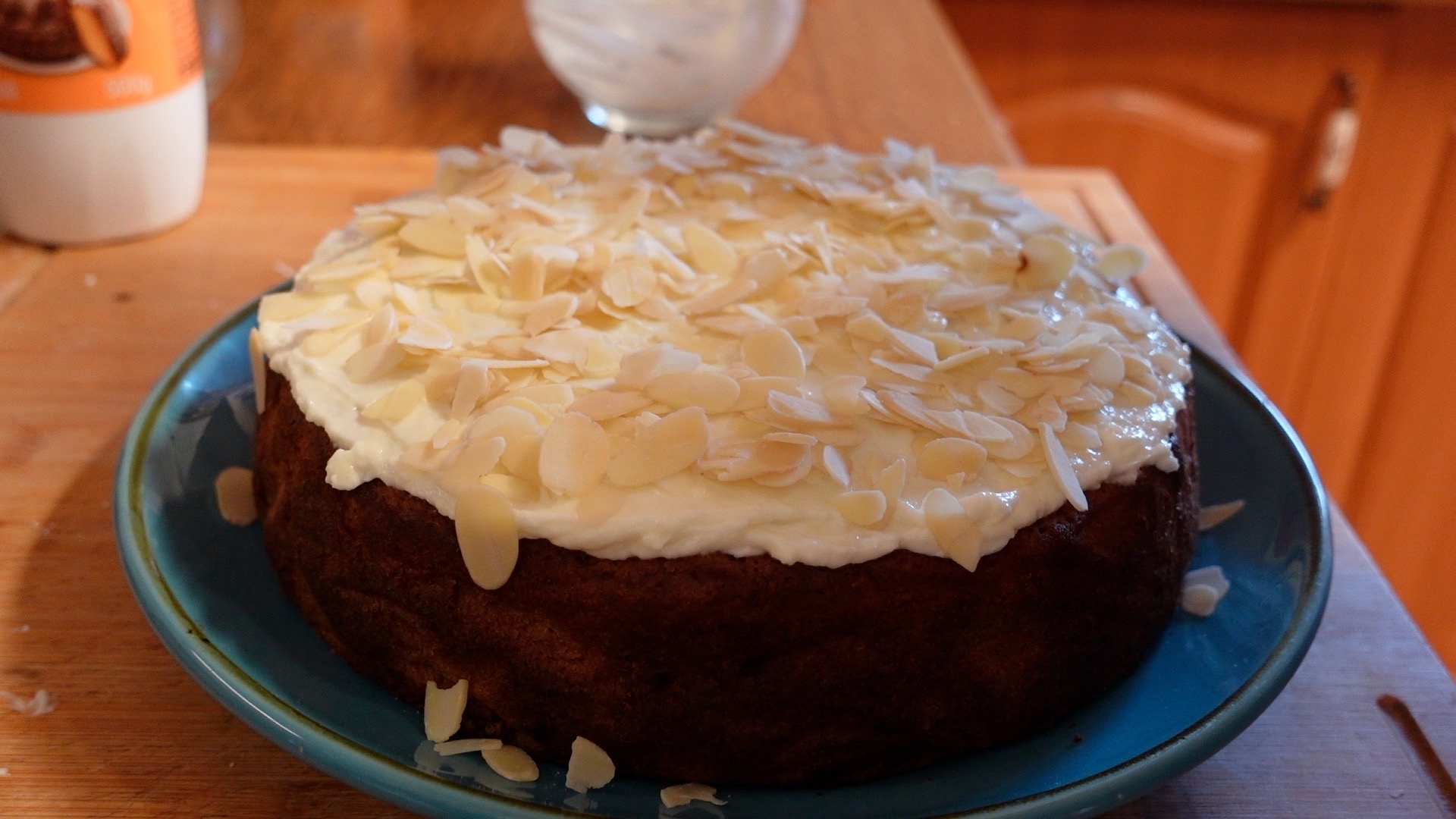 이게 완성된 당근케이크이지만, 이 케이크를 반으로 잘라 프로스팅용 크림을 넣거나 위쪽에 크림을 발라 장식하면 훨씬 고급져 보입니다. 단 오븐에서 꺼낸 케이크는 두세 시간 식혀서 뜨겁지 않은 상태에서 장식해줘야 견고한 모양을 유지할 수 있어요.