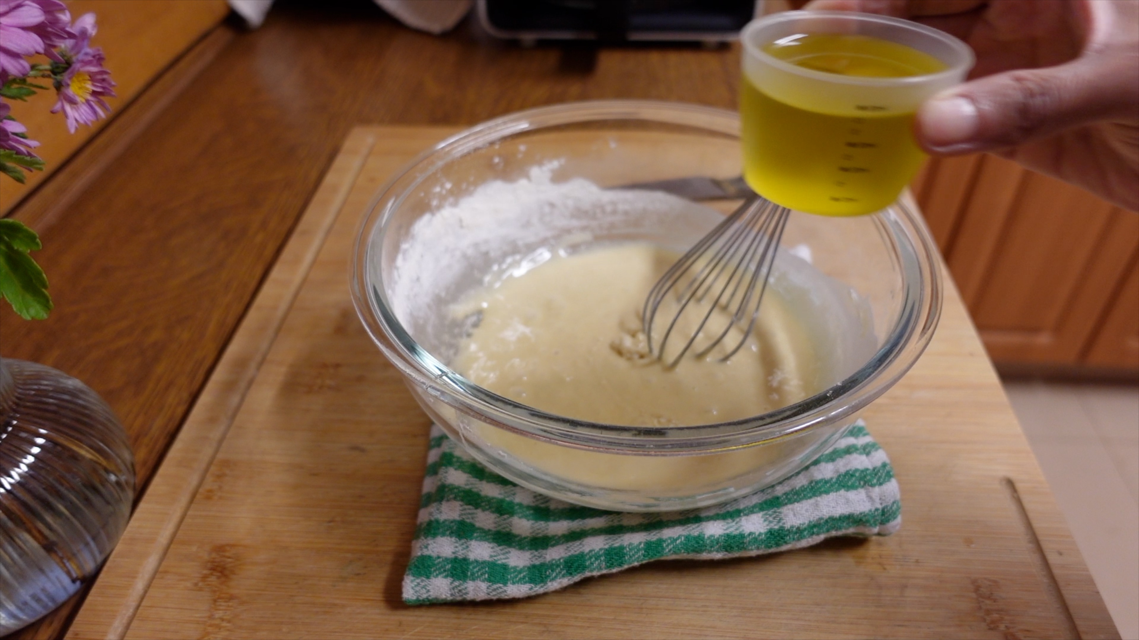 여기서 중요 포인트~! 케이크의 맛을 부드럽게 해줄 식물성 기름을 넣어주는 겁니다. 80ml 넣어 주시고, 잘 섞으면 주르륵 흐르는 반죽이 된답니다. 기름은 저는 올리브유 생산국에 살기 때문에 올리브유를 넣어줬습니다. 여러분은 집에 있는 식물성 기름 아무 거나 넣어주셔도 됩니다.