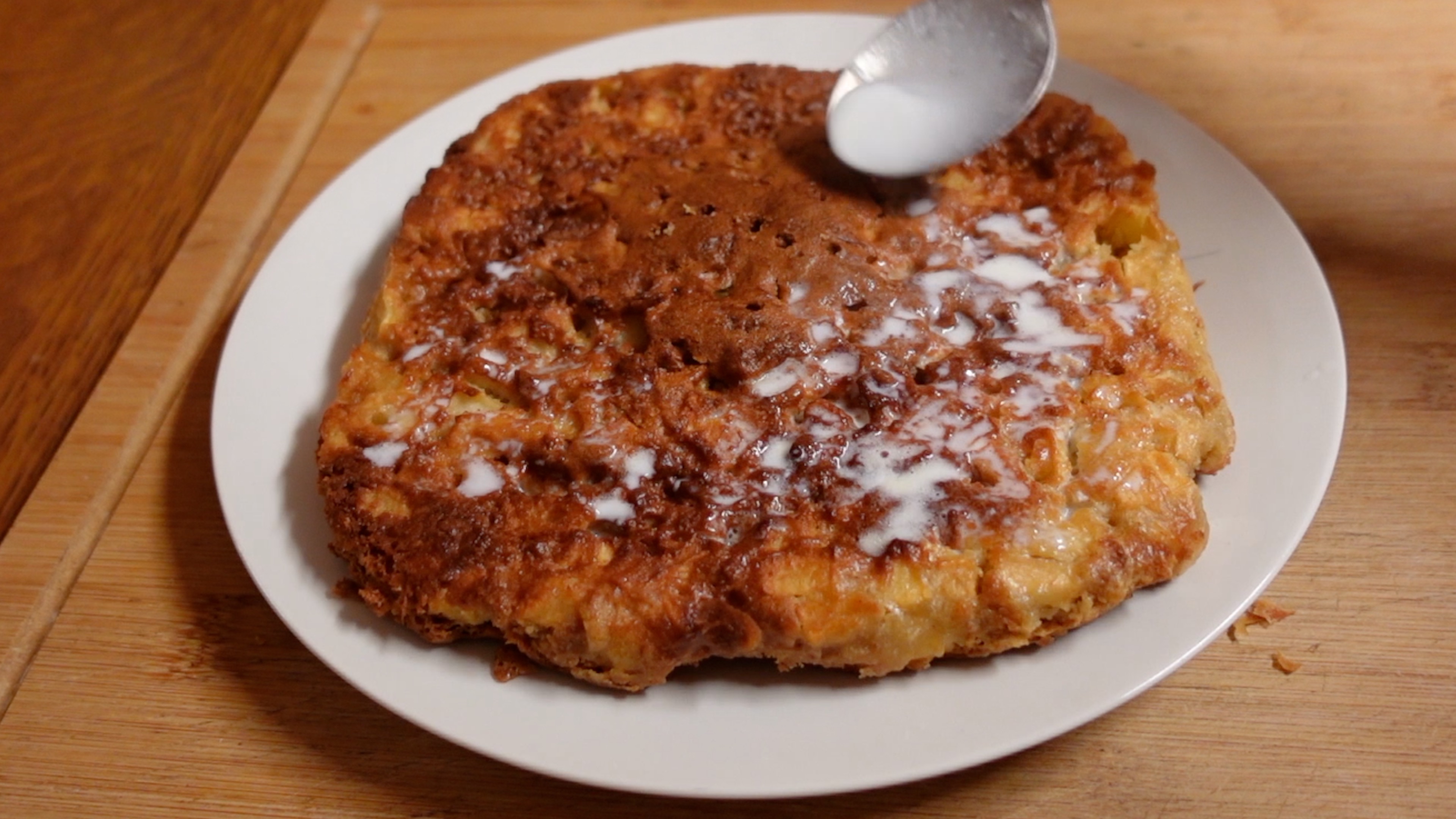 그러고 나서 우유 80ml, 설탕 1 큰 숟가락, 버터 25g을 녹인 따뜻한 우유버터를 이 케이크 구멍에 흠뻑 적시게 넣습니다. 위의 사진처럼 숟가락으로 떠서 흘리면 아주 쉽답니다. 그러면 완벽하게 맛있는 사과 케이크가 완성됩니다~!!! 👏👏👏👏👏