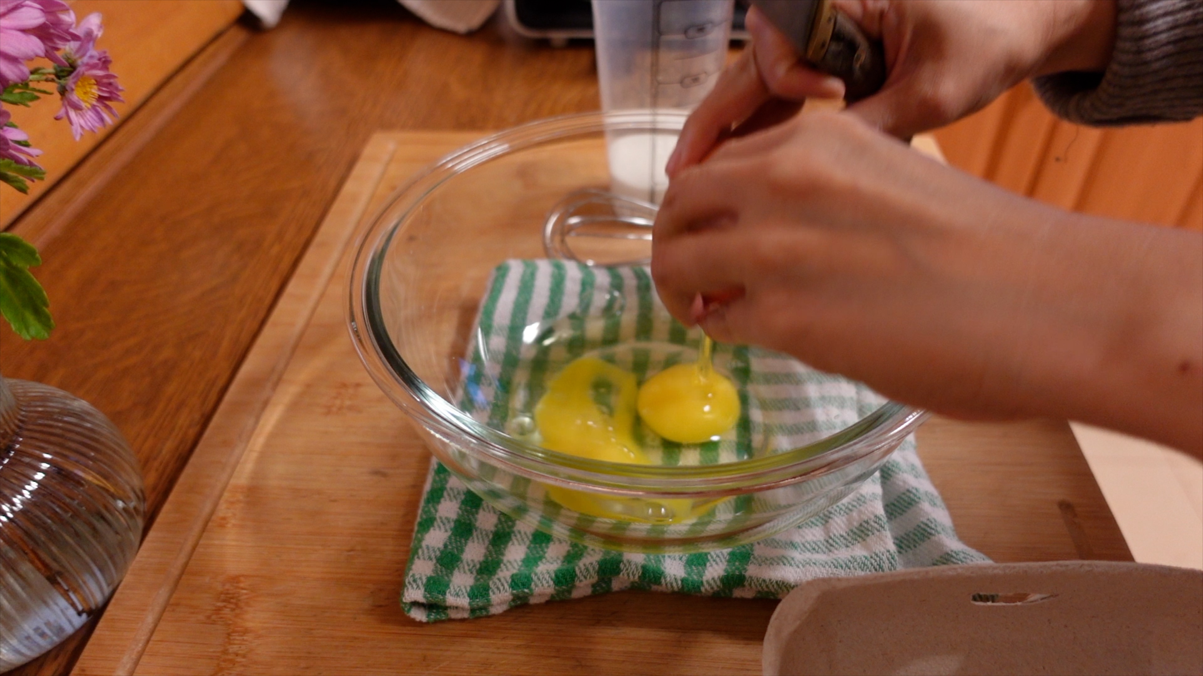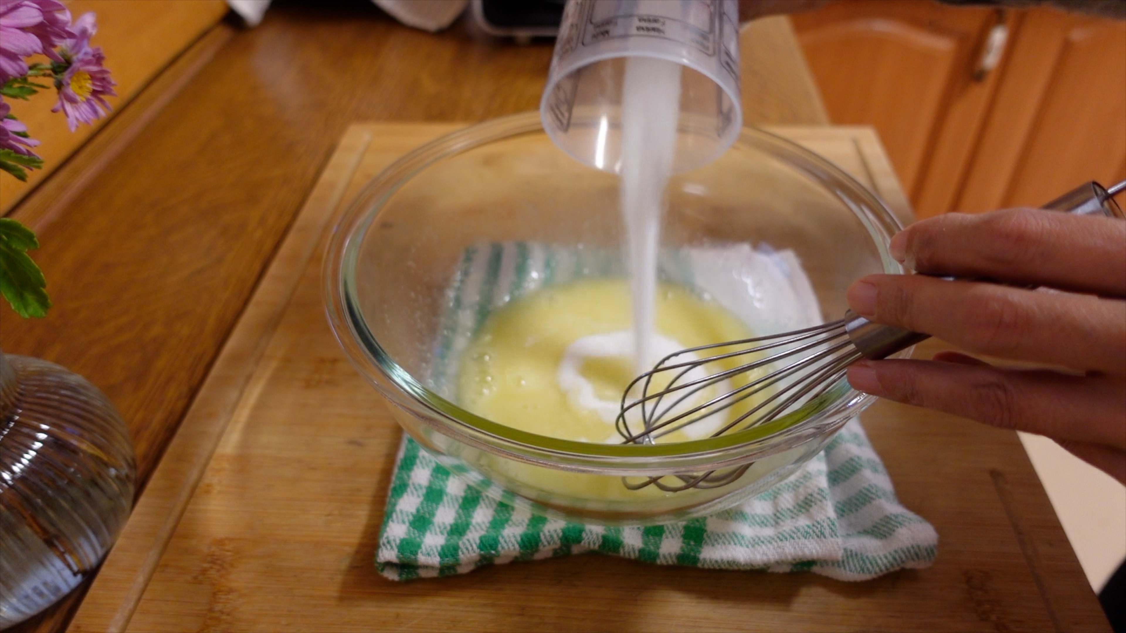 달걀 2개를 큰 볼에 넣고, 설탕과 바닐라 설탕을 조금씩 넣어가면서 잘 풀어줍니다.