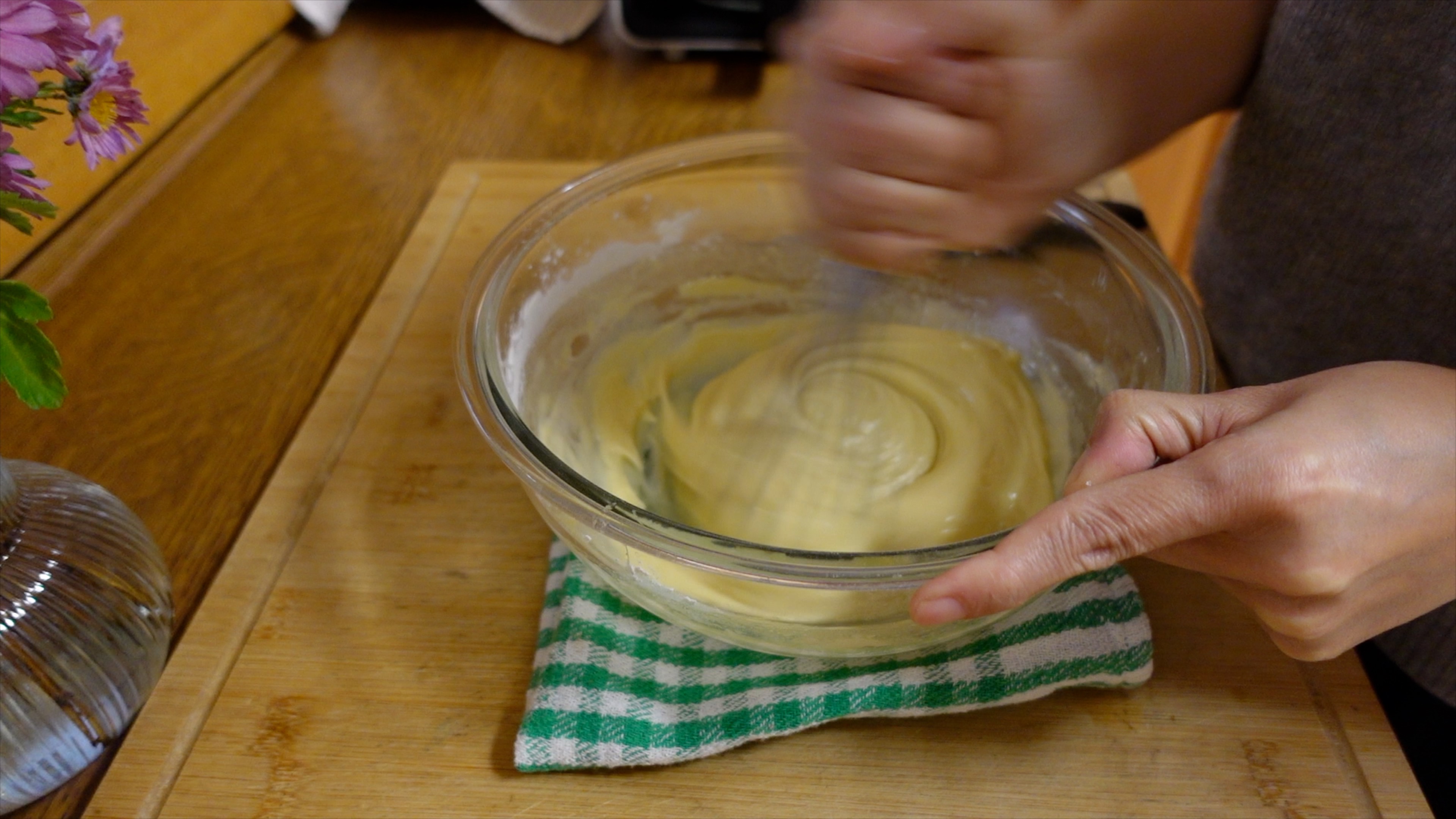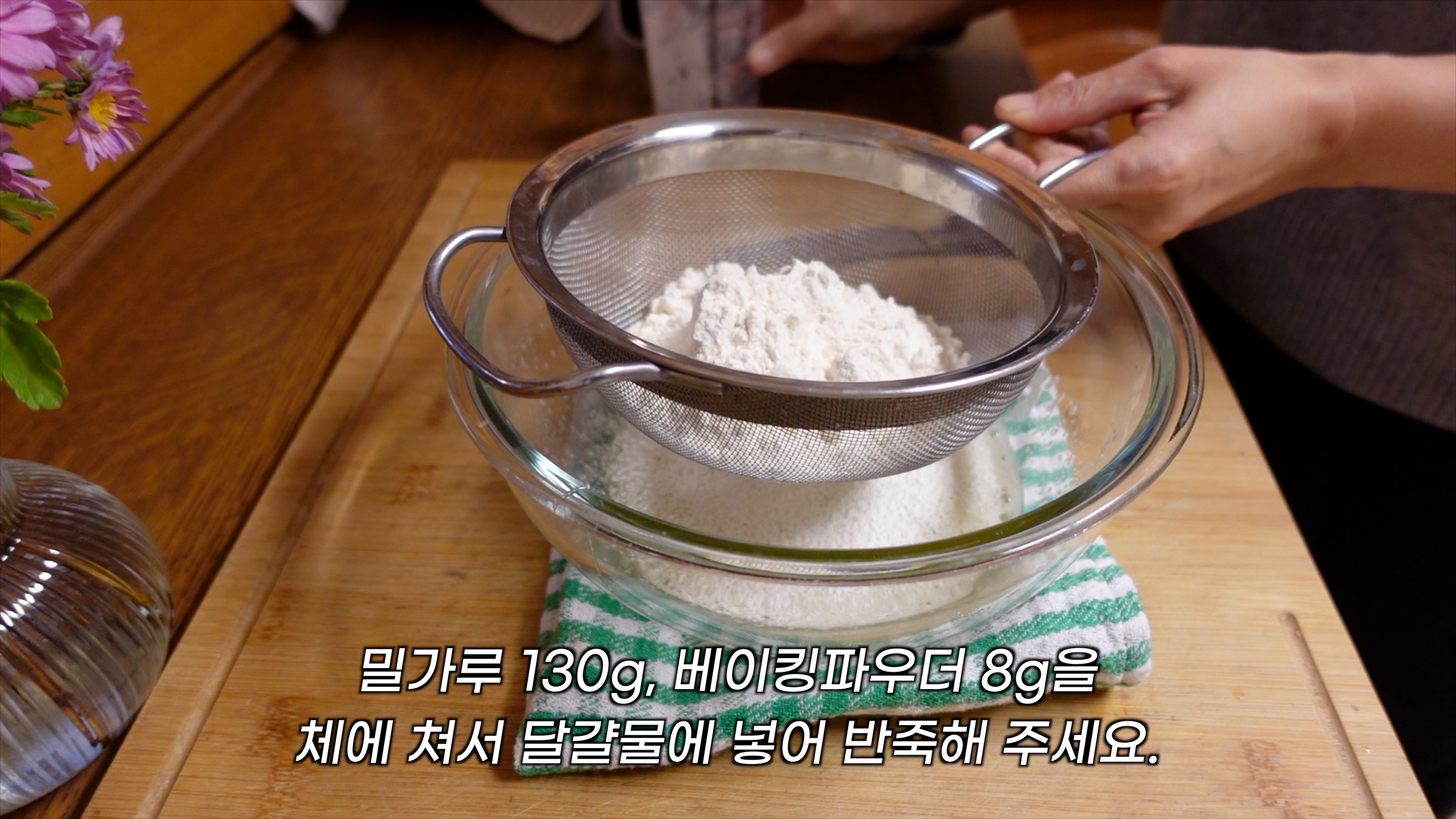 그리고 위의 사진처럼 밀가루와 베이킹파우더를 체에 쳐서 달걀물에 넣어 주걱이나 거품기로 잘 반죽해 주세요.