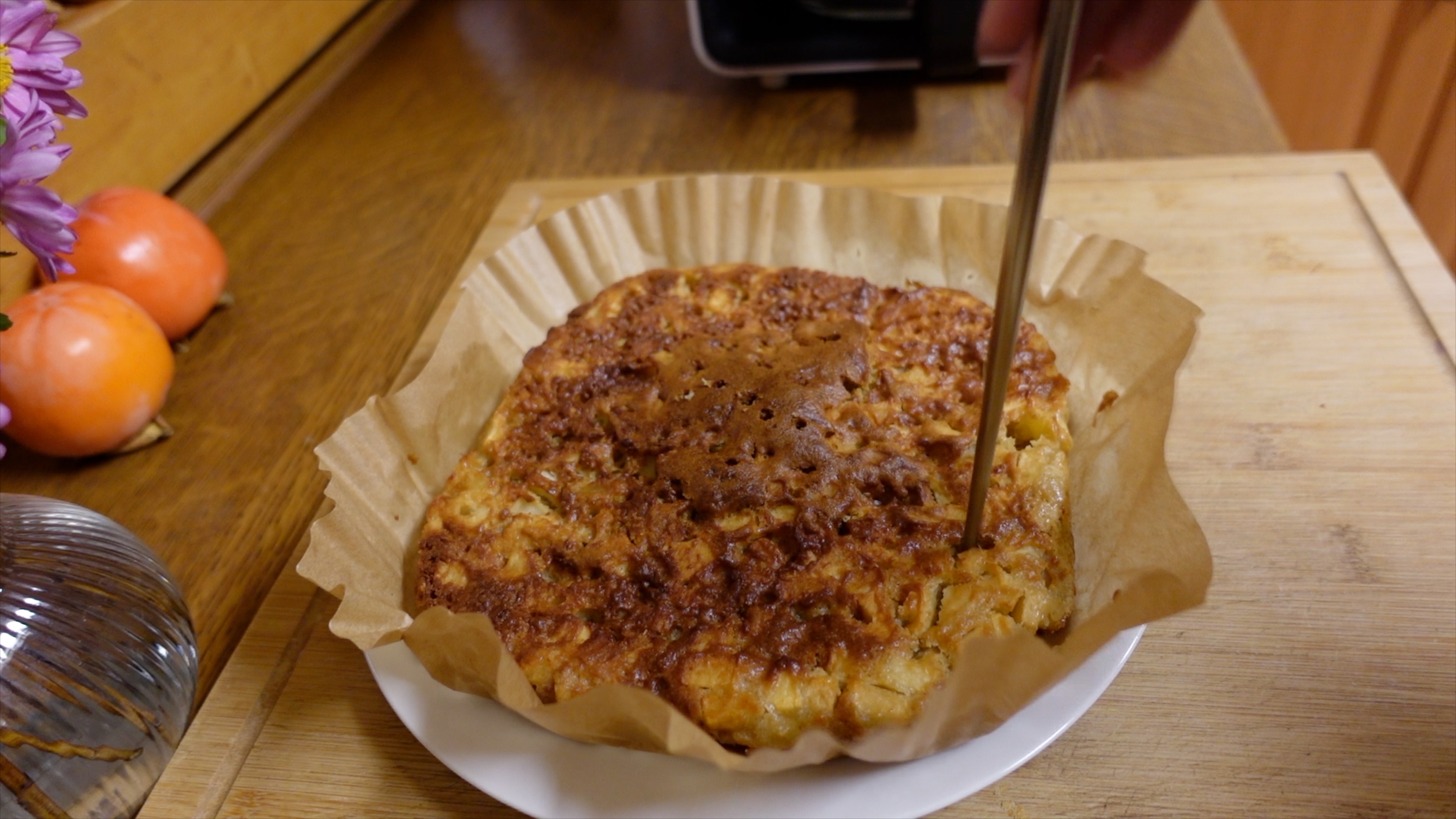 일단 구워지면 젓가락으로 찔러가면서 잘 익었나 확인하시고요, 뒤집을 때는 이렇게 유산지 하나를 상부에 덮고, 다른 접시를 올려 뒤집으면 아주 쉽게 뒤집을 수가 있답니다. 뒤집은 후 다시 사과케이크를 바스켓에 담고, 에어프라이어 165도 20분 정도 구워주면 아주 바삭하고 풍미가 제대로인 사과 케이크를 접할 수 있답니다. 🍎