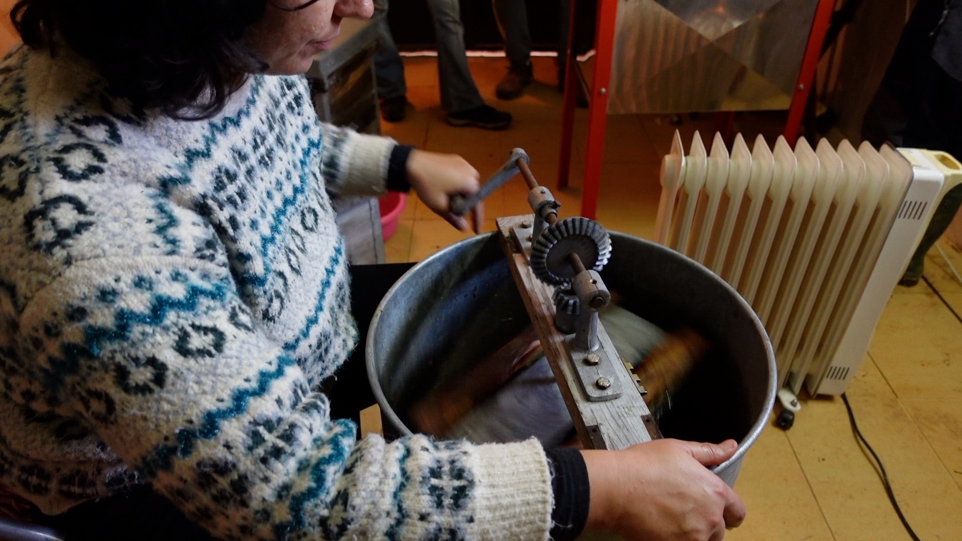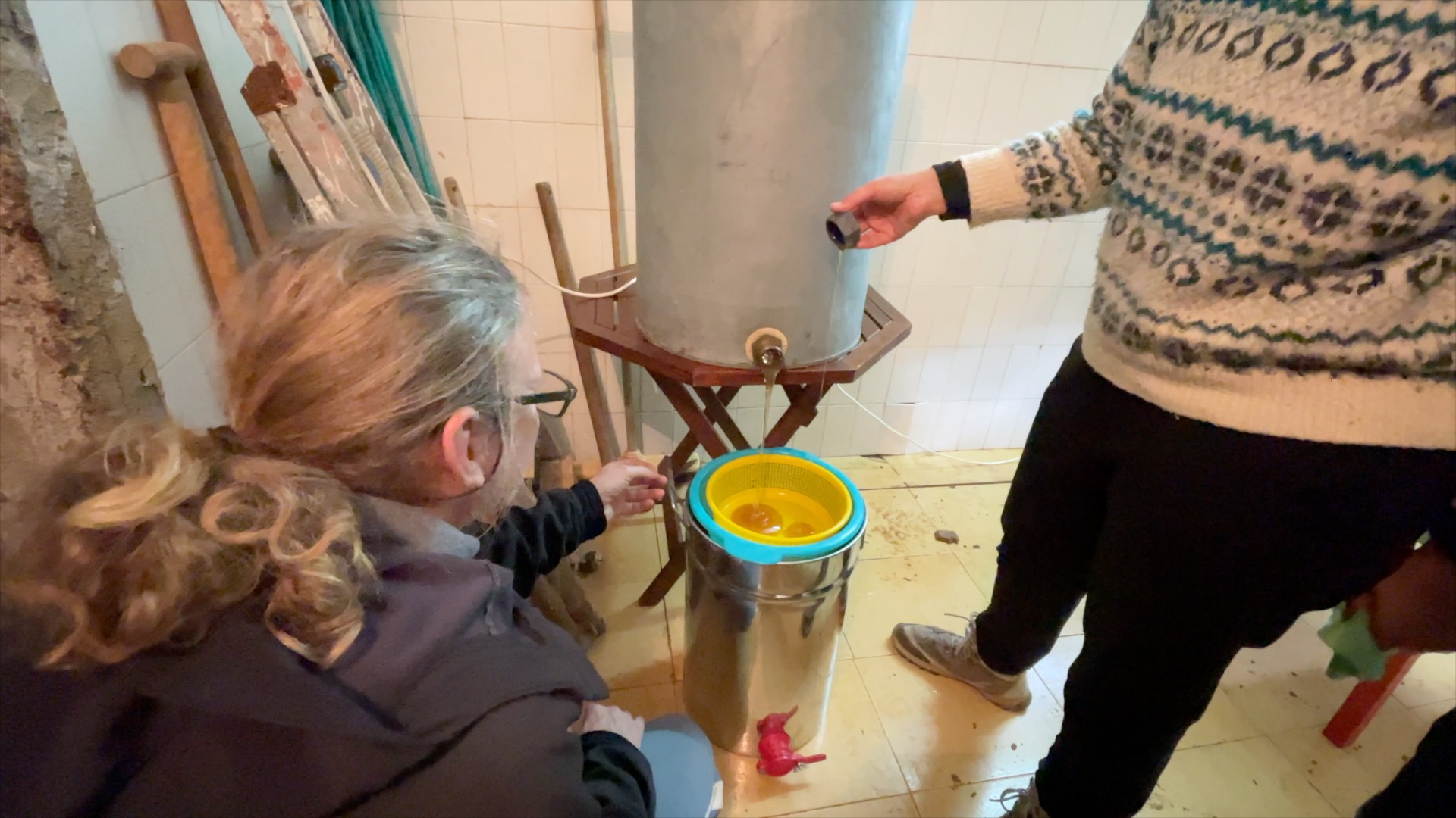 이제 봉개 작업이 끝난 벌집을 원심 추출기에 고정하여 꿀을 추출합니다. 위의 사진에서 하는 방법은 수동식인데, 너무 크게 힘을 주지 않고 벌집 원형을 보존하면서 꿀을 추출합니다. 원심력에 의해 돌아가면서 꿀이 벽을 타고 흘러내리는데요, 꿀이 채워지는 모습도 아주 달달합니다. 이 원심 분리기로 추출하고 난 벌집은 밀랍을 파괴하지 않고 다시 사용한다고 합니다. 벌떼가 육각형 모양의 벌집을 다시 만드는 데 에너지를 소비하지 말라고, 다시 이 벌집을 사용한다고 해요. 지속 가능한 벌집 사용이라 아주 효율적이라고 합니다.
