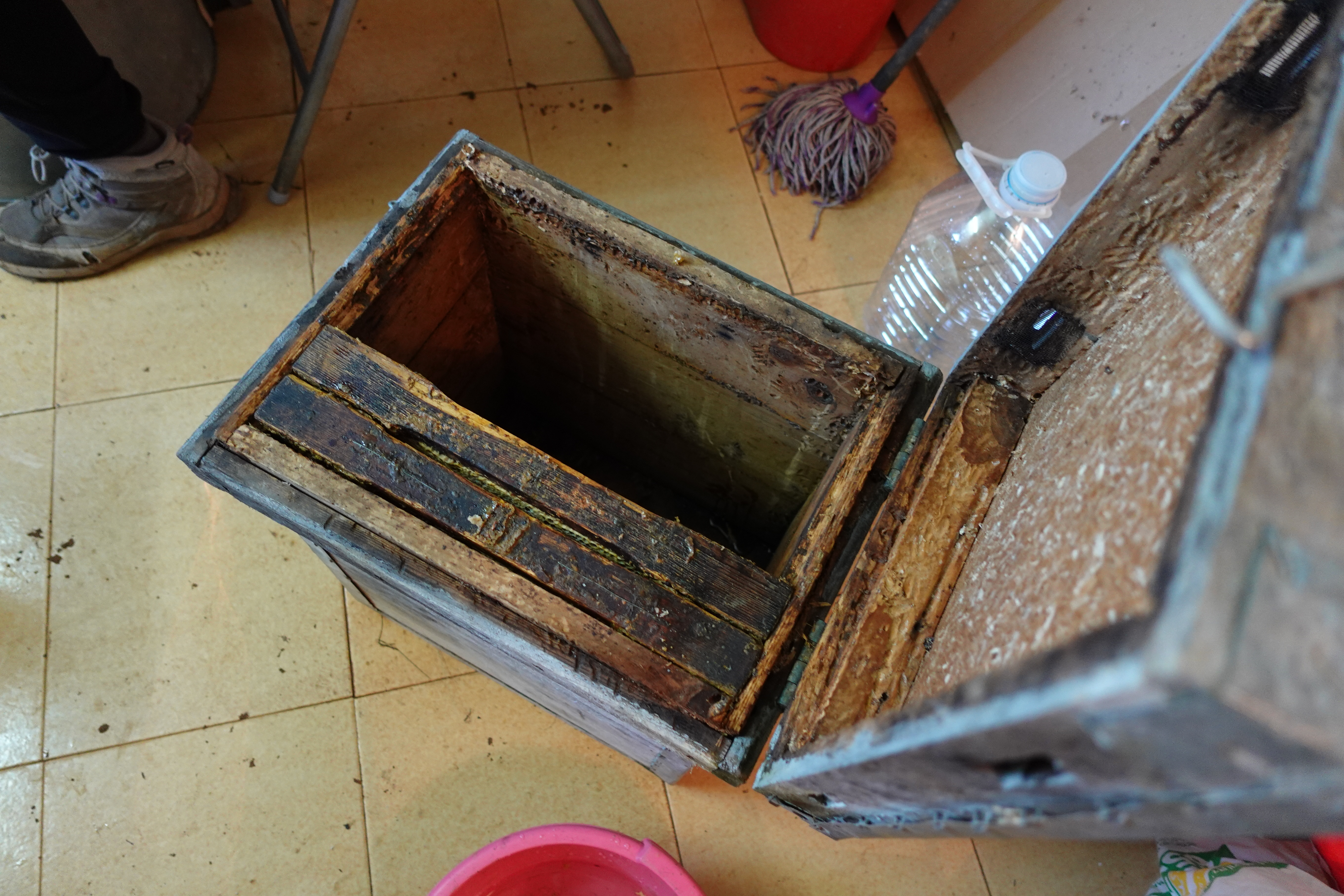그렇게 벌집을 꺼내어 붙어있는 꿀벌을 제거하고 이동이 쉬운 상자에 담아 벌 떼가 없는 곳으로 갑니다.