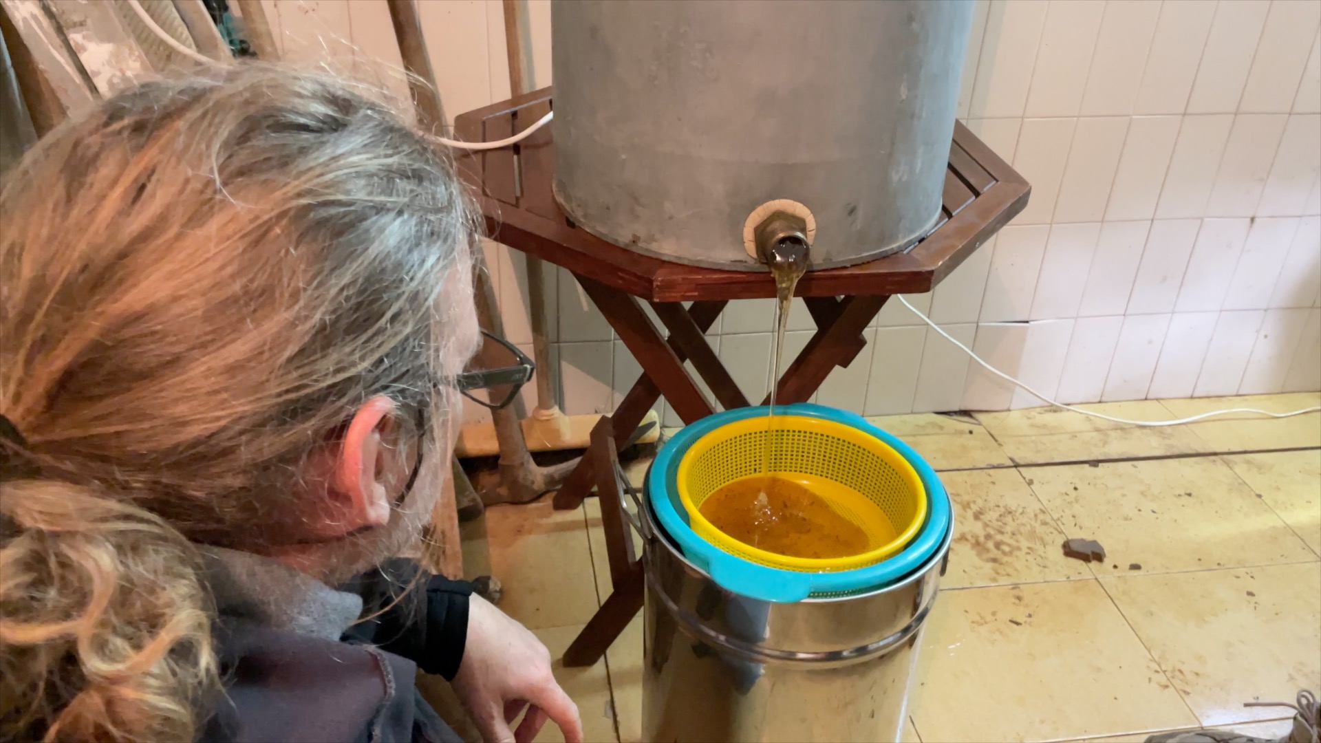 원심 추출기로 뽑아낸 꿀은 아래에 달린 꼭지를 열어 다른 통에 옮깁니다. 이때 벌집에서 튀어나온 이물질 및 밀랍을 체로 걸러내는 작업을 해요. 그럼 깨끗한 100%의 꿀이 된답니다.