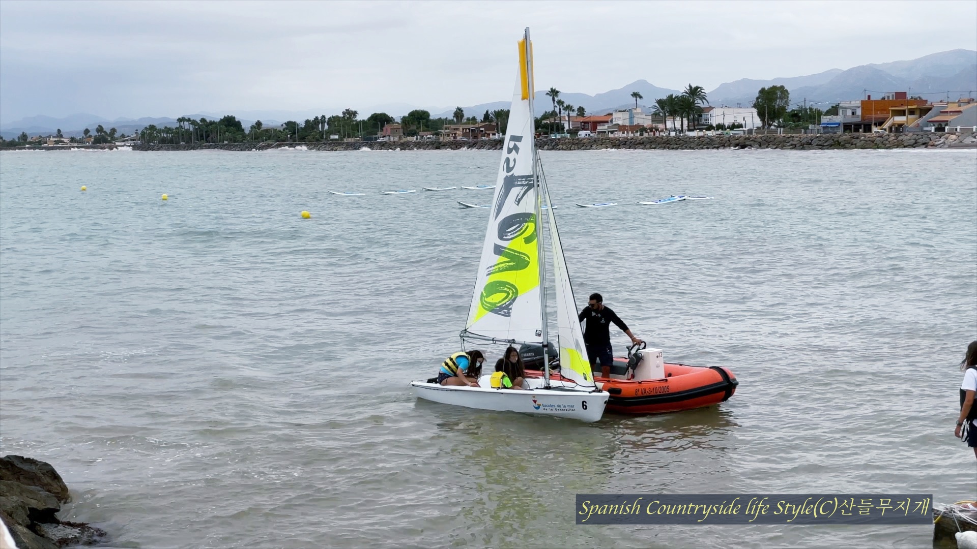 일단, 발렌시아 정부에서 운영하는 바다 학교는 두 군데 있습니다. 관광 휴양도시인 베니카심(Benicassim)에 하나, 또 하나는 부리아나(Burriana)라는 지중해 연안의 작은 항구 도시에 있지요! 참가자는 만 9세부터 만 99세까지 가능하고요, 운영은 12월과 1월을 뺀 10달 내내 운영한다고 합니다. 보통 5박 6일, 주말, 학교 기준에 따라 하는 훈련 등이 있습니다. 여름에는 자신이 원하는 스포츠를 중점적으로 배울 수 있고, 이벤트 형식은 여러 스포츠를 여러 날 이것도 배워보고 저것도 배워보는 형태로 하고 있지요. 예를 들면 우리 아이들이 부활절 기간에 배운 스포츠는 아주 다양했어요. 세일링, 요트, 윈드서핑, 패들서핑, 카누 등 다양한 스포츠를 배웠지요. 부활절이라는 이벤트를 더해 영어로 가르쳐주는 코스이기도 했지요. 하지만, 이번 여름에는 돛을 올려 방향을 바꿔 이동하는 세일링만 전문으로 배웠답니다.