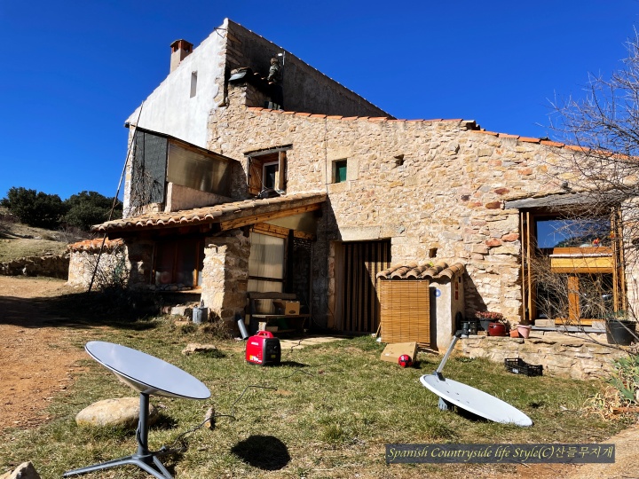이곳은 전기도, 수도도 쉽게 들어올 수 없는 곳이랍니다. 스페인 땅덩이가 너무 넓어 그런지 마을에서 아주 벗어난 외지에는 아예 전기관이나 수도관이 연결되지 않았습니다. 연결하려면 자비를 들여 장비를 설치해야 하는데 그 비용이 어마 무시하답니다. 그래서 우리 가족은 태양광판을 설치해 전기를 이용하고, 빗물을 받아 생활수로, 샘물을 받아 식수로 사용한답니다. 그렇게 14년 살아도 전기와 물 때문에 생기는 큰 문제는 없었습니다. 다만.... 요즘 같은 테크놀로지 시대에 인터넷이 제 기능을 발휘하지 못하는 건 큰 문제가 되더라고요. 우리가 지금 사용하는 인터넷은 마을 농촌 진흥 시스템 일환으로 설치된 귀피(guifinet)넷이라는 네트워크 시스템으로 마을과 마을, 농가와 농가가 서로서로 연결하여 인터넷을 유지하는 시스템이랍니다. 전기와 전기선이 없는 곳이니 당연히 태양광 와이파이 안테나를 곳곳에 설치해 기능을 유지하고 있었어요. 물론 지금도 유지하고 있습니다. 문제는 날씨가 흐리고 비 오고, 눈 오는 날에는 안테나가 제 기능을 하지 못하고 신호를 잃어버립니다. 요즘은 안테나를 교체해야 할 시기인지 문제가 너무 자주 발생해 인터넷을 사용하는데 어려움이 있었어요.