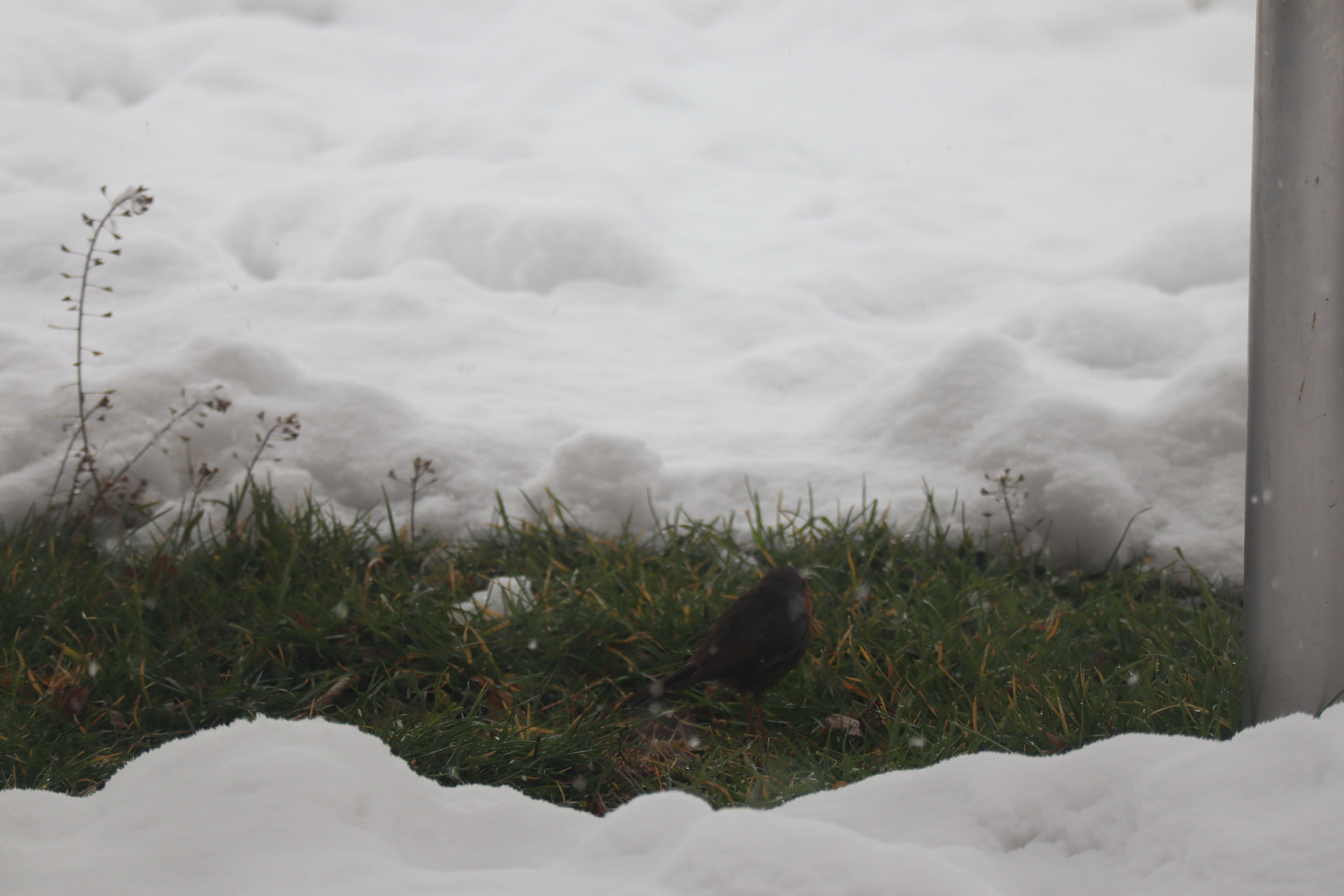 눈과 비를 피해 마당 앞 식탁 아래로 찾아 온 유럽 울새가 보입니다. 겁도 없이 집 근처까지 오다니...... 그래도 이곳이 이 날씨에서는 제일 안전합니다. 산드라가 뿌려놓은 새 모이를 먹을 수 있으니 말이에요.