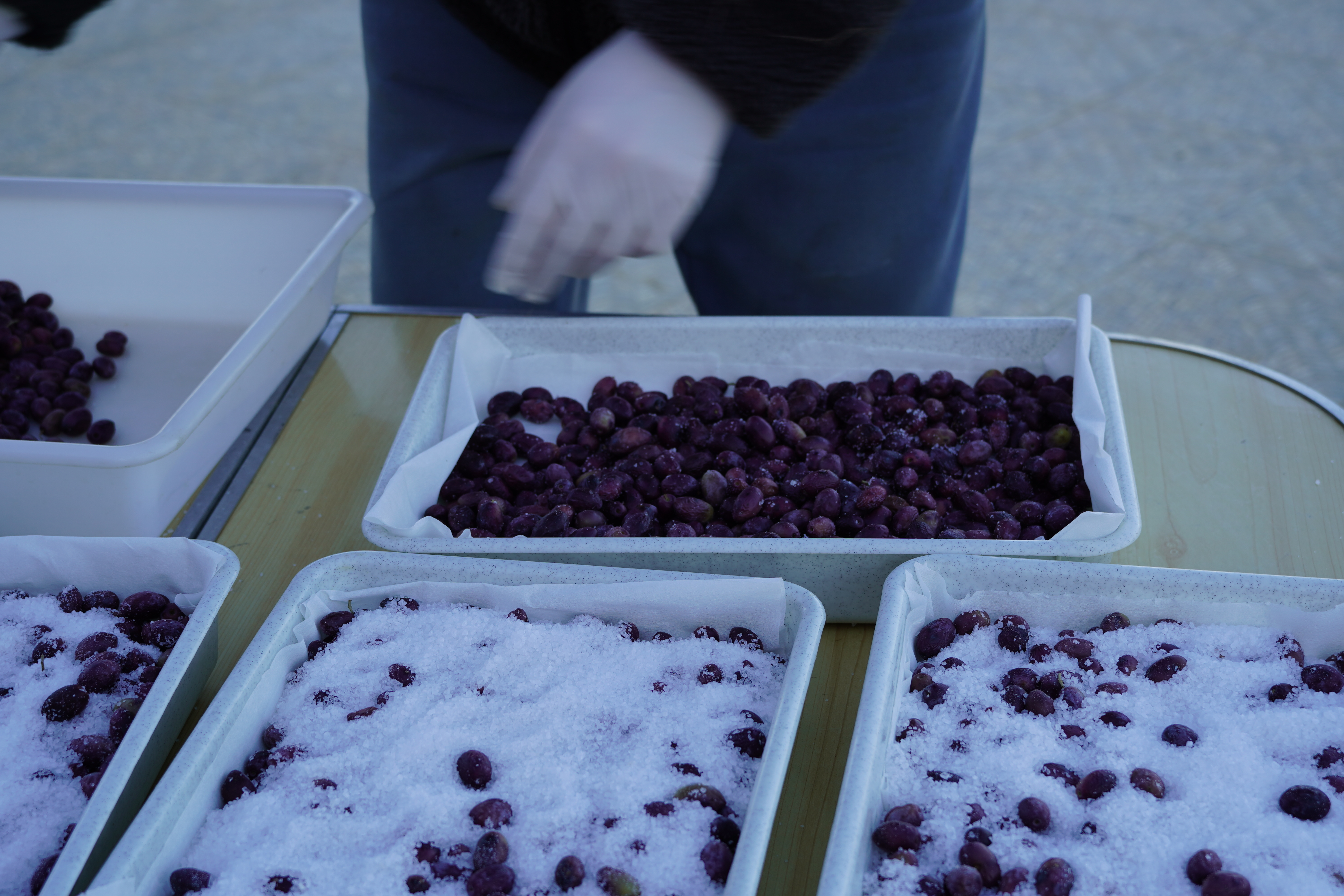 위의 사진처럼 수확한 올리브를 잘 골라냅니다. 농약을 치지 않아서 벌레 먹은 열매가 많아 이렇게 일일이 손으로 골랐어요.