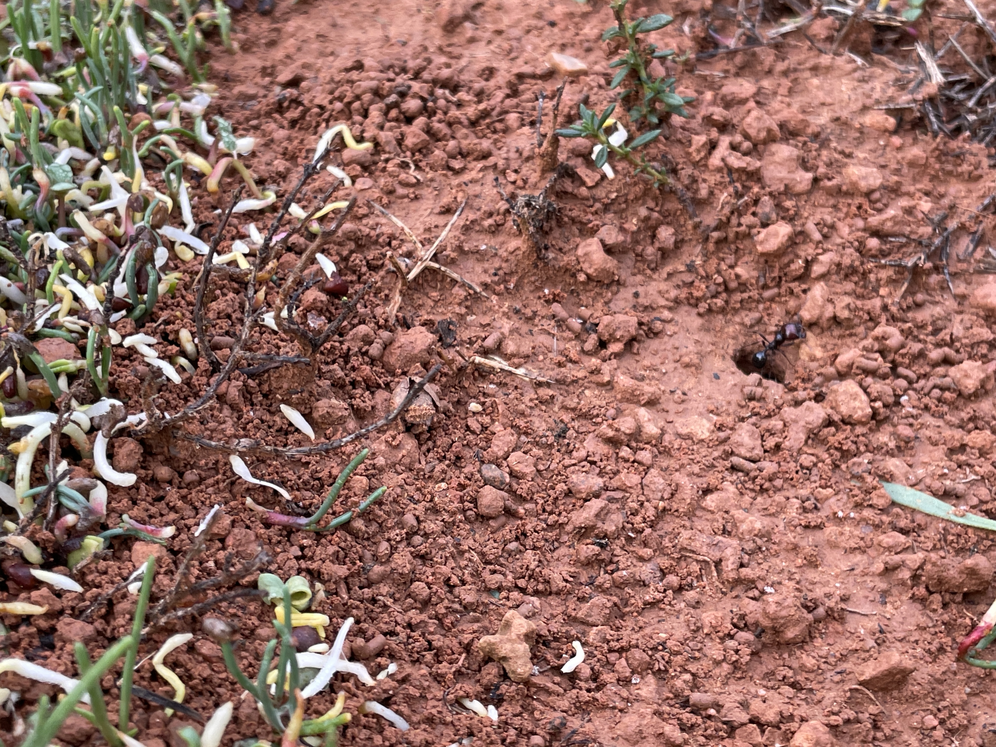 개미가 밖에 내놓은 발아한 씨가 개미구멍 주변에 쌓여 지금 자라고 있는 모습