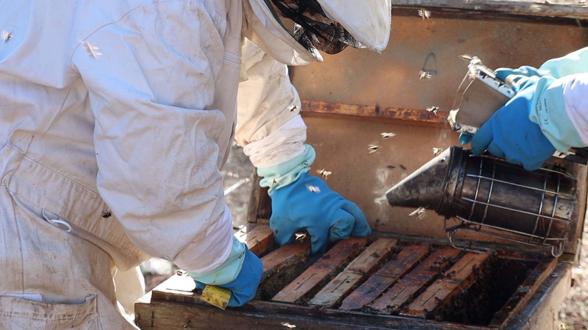 여러분들은 꿀벌통에서 벌집 꺼내는 모습을 보셨나요? 이렇게 옷을 단단히 입고 난 후, 꿀벌이 진정하는 해 좋은 날에 벌통 뚜껑을 열고 조심스럽게 벌집을 꺼냅니다. 벌집을 꺼낼 때 훈연통으로 연기를 내주면 벌이 공격적으로 쏘아대지 않는다고 해요.