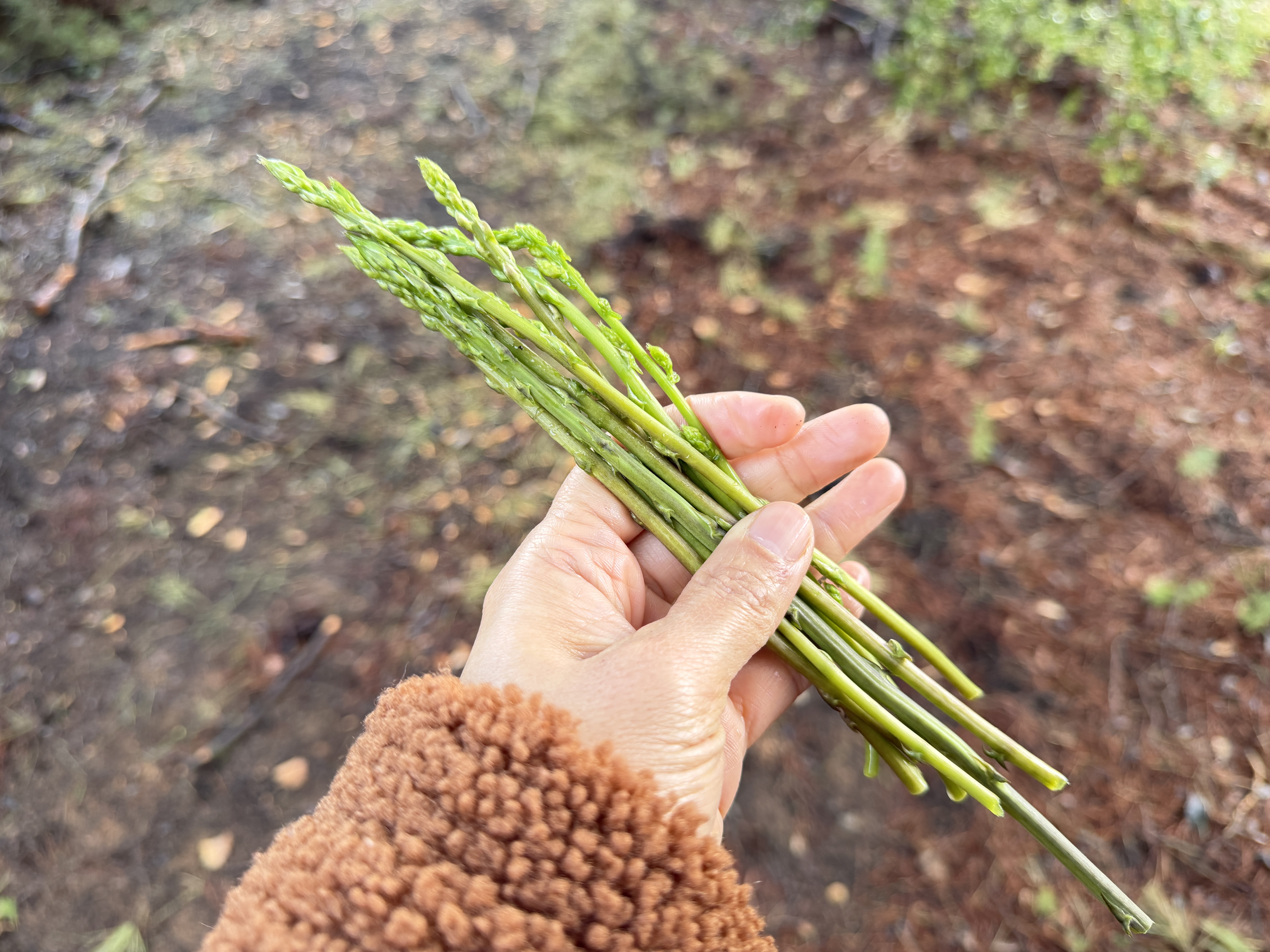 자, 제 손에 요렇게 야생 아스파라거스가 가지런히 모아지고 있습니다. 야생은 시중에서 파는 것보다 아주 가늘고 얇아요. 게다가 자라면 가시덤불이 돼 만질 수도 없게 됩니다. 하지만, 요런 순일 때는 연하디 연하고... 맛있습니다! 아! 많은 분들이 이 야생 아스파라거스가 어떤 맛인지 궁금해하십니다.